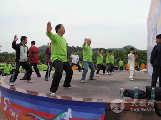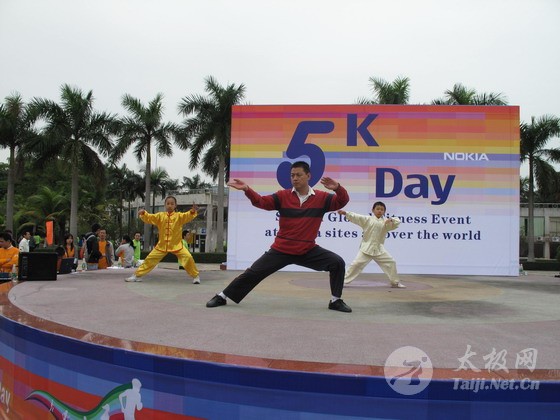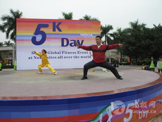 太极馆参与诺基亚全球五公里日 11月14日,在东莞虎英公园广场上四百多东莞诺基亚员工整装待发,要以跑步或行走的方式完成五公里路程。因公司在五月份就以开始太极培训,各方对陈氏太极拳健身和养生反映良好,所以要求我馆支持这个活动。
