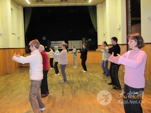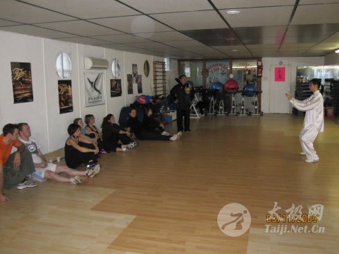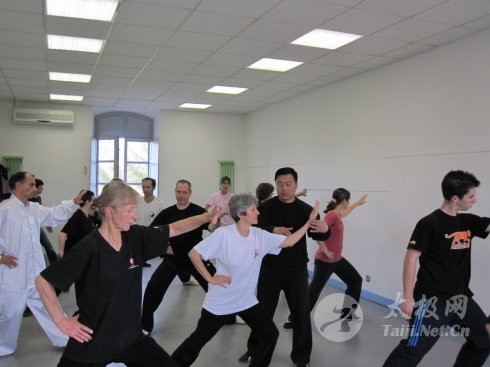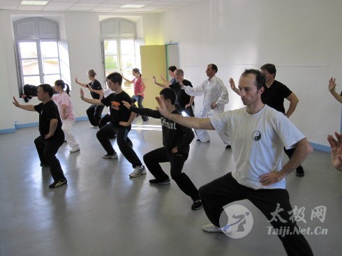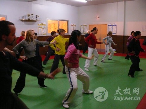 认真模仿动作 张东武老师十四年来一直往返于中法两国,致力于太极拳的传播。以往,张老师一直在巴黎从事太极拳教练的高级培训.为了能让更多的人了解,感受,并得益于太极拳,这一次,张老师在法国太极学院的精心组织下,深入到法国中部克雷兹,南部蒙彼利埃以及普罗旺斯等地区进行太极拳的普及和推广工作,所到之处,都给学员们留下了难忘的印象,受到了广泛的赞誉。 太极拳博大精深,越是深入进去,越能体会到它的奥妙无穷。然而对于初学者,尤其是对于还不了解太极拳的法国学员来说,往往会因为不知从何着手,或是对于太极拳片面的认识,而不敢问津或半途而废。如何即能让初学者体会到太极拳的独特魅力,又能引导学员由浅入深,有法可循,循序渐进地学习和提高技艺,成为我们学院在今后的太极拳普及和传播中需要思考的首要问题。作为学院的首席总监,张老师此次赴法亲自参与所有面向初学者的太极普及课,为我们的学院提供了宝贵的普及和推广太极拳的教学经验。 正如张老师所说,太极拳的普及要根据不同人群的特点,因材施教,不可一个模式照搬.为了贯彻这个思路,此次,学院专门为不同年龄层次的人群开设了有针对性的课程。  陈氏太极拳也吸引了越来越多的法国青少年 比如对于老年人,我们开设了太极养生功。在课上,张东武老师建议老年人采取高架位练习缠丝,取消了准备活动中幅度较大的拉伸动作,并着重带领大家进行太极桩功的练习,采气,养气,引导大家进入放松入静的状态。  法国中部克雷兹地区的中老年学员正在练习太极养生功 法国当地一家体育用品连锁超市迪卡侬的负责人联系我们,请我们教他们的员工打太极拳。因为都是年轻人,并且从没有接触过太极拳,张老师首先对太极拳做了简要的介绍,而后带领大家从基本功练起,包括每一个准备活动和缠丝的动作,都严格要求,一丝不苟,并且还演示太极拳某个动作的用法,提高大家的兴趣。培训将要结束时,我们学院的教练还为大家做了太极拳的表演。课程结束后,所有员工都被张东武老师干练的教学风格和深厚的功力所震憾,纷纷前来向他表示诚挚的感谢。通过自己的亲身实践,所有的员工也都是大汗淋漓,他们的负责人对我们说,很多人都以为太极拳是一种慢悠悠的老年人运动,直到今天他才见识到真正的太极拳。  学院的教练为法国迪卡侬体育用品公司的员工们表演太极拳
