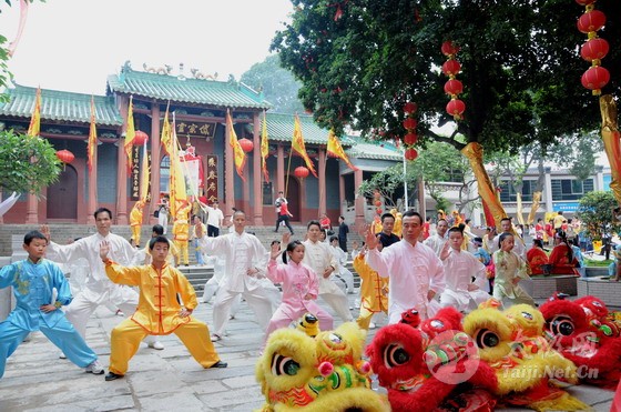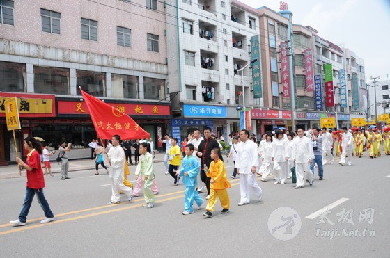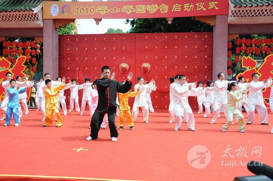 德生太极馆参加茶游送福 5月8日~10日,东莞茶山镇重办“茶园游会”,使这一停办60年的民俗活动再现活力。据介绍,茶山镇今后将继续举办“茶园游会”,并将其打造成为该镇的文化品牌。 据茶山镇志记载,茶山“茶园游会”活动已有500多年历史,在每年农历三月廿五至廿七,茶山当地居民及四方香客、游人会来到东岳庙祭祀,高抬东岳大帝和民间吉祥物出巡,祈求风调雨顺、国泰民安。 本届游会活动将由东莞市委宣传部与茶山镇政府主办,在开幕式上,由菩萨方阵、舞龙队、民间艺人表演方阵、群众方阵、醒狮队等将近700人组成的岭南民俗巡游表演将从该镇中心区内街出发,进行1个小时的特色巡游。此外,茶园游会期间还将举行“茶山论道”活动,邀请知名道学家畅谈道学精髓,东岳庙内还会有道教文化展及一系列祈福活动。 德生太极馆三十余人为开幕式表演了陈氏太极拳架.并参加了送福游行.
