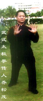 乔松茂,河北张家口人。九岁随 在黄埔军校当过国术教官的舅父张汉杰老师学练少林、通臂、黑虎、六合拳等,奢武如痴。1971年到邯郸县插队,有人见他这样迷恋于武术,就介绍到武式太极拳第四代传嫡传人李锦藩那儿。由于李老师与乔松茂的身世都很有渊源,所以,两人非常投缘。通过交谈,李师得知乔松茂想寻求太极拳的真谛,在乔松茂的请求下,李老师欣然接受了这位后来在武式太极拳的普及和发展上做出卓越贡献的乔松茂为徒。 从1972年开始学习武式太极拳,他每天下班后到李老师处学习,而李老师也是一招一式的精心传授。由于当时的历史条件所迫,学拳还不是很公开,而且也只教乔松茂一人,每每练到更深人静。这样日复一日,年复一年的渡过了8个春秋,乔松茂技艺大进,师徒的感情也愈加深厚。然而,李师到了离休的年龄,要回老家永年广府镇,临行前对徒弟做了交待:“我离休了,武式太极拳我都交给你了,今后就看你自己练了。”乔松茂却说:“以后我每周末到您家一次,继续学拳和聆听您的教诲。" 说是容易做是难。在李锦藩离休的10年中,乔松茂几乎每个星期六下班后都独自一人骑自行车从邯郸市到永年广府镇老师家里,往返120多华里,星期一早上再骑车赶回邯郸上班,无论是烈日炎炎的盛夏,还是寒风刺骨的严冬,从不间断。乔松茂离乡在外,把老师的家当做自己的家,有活就干,有事就办。而李老师同样把他当做亲儿子一般;问寒问暖,见他几年来如一日,风里来,雨里去,很是心疼,就对乔松茂说: “武式太极拳我都交给你了,以后,就不要每个星期六都来了。”乔松茂回答:“您教我拳是我师父,教完了还是我师父。我来一是学拳,二是探望和侍候您。”李锦藩被这一如既往的真诚所感动,找到本家叔叔李泽堂(李亦畲的孙子),向其说明乔松茂多年来刻苦学拳,心诚志专,认为儒子可教。由于历史和门派的原因,李家家传拳艺不外传,李泽堂说:“先教他五成功夫吧。”这样一学又是2年。他还是照旧一日不误每周末到老师家,而且愈加敬重老师。 通过十多年的相处,老师深深的了解了学生。面对这般诚心求艺、品学兼优的徒弟,他再一次找到李泽堂,召集李氏家族代表,商量如何对乔松茂的传授问题。李锦藩说:“李家拳艺是先辈留下来的宝贵遗产,虽然很少传外姓人,原因之一是未选择到合适的人,如今乔松茂这样诚心学艺,可以将应传的东西全部传给他,不能让拳艺到我们这一代绝传。如果在我们这一代绝传,我们将是历史的罪人。”通过认真讨论,终于决定将李家家传的武式太极拳的全部要领、要术传给乔松茂。这使得乔松茂豁然贯通、如虎添翼,为他后来的云游、应战打下了坚实的基础。 为了更深的了解武术,掌握太极拳的精髓,乔松茂自费到武当山、赵堡镇、上海等地,广结豪杰侠义之士,虚心求教,苦心专研。终于,功夫不负有心人,他的技艺达到了上乘,使得他屡战屡胜,名扬中外。然而,不服者有之,好奇者有之,登门求教者亦有之。 一次,一位朋友与他的老师来到乔松茂家,乔松茂热情地招待他们吃饭。那位老师是一个外家门派的传人,说:“我们先交手,后吃饭。”乔松茂平常不轻易与外人交手,只有在不得已时才与人搭手。经他再三推辞,对方坚持要切磋试手,两人便在家中的小厅里搭上手。对方一架上手想变换虚实,换手发劲进攻,但乔松茂一搭上手便接住对方的劲,跟住对方的劲,对方退不得,也换不得劲,尽处背势。乔松茂并不发劲,连续三次都封死了对方,对方服倒在地。 在山西杨式太极拳协会成立10周年举办的名家讲座上,新加坡推手冠军董先生听了乔松茂的讲学后,找到乔松茂请教太极拳艺,要求推手较艺。董高大魁梧,乔身矮一截,结果董两试两负。会后,他专程追至邯郸拜师学艺。 另有一位习武者,听说乔松茂功夫非常了得,寻友人想拜会一下。乔松茂与同来者表演了“单指发人”、 “解脱擒拿”、 “以腹发人”.等上乘绝技,但那位习武者感到“太玄”、“不能理解”露出疑惑之色。乔松茂看透了他的心思,便邀他一试。那武夫心中暗忖“凭着自己多年来苦练太极拳的功底,还赢不了你?再说,今日遇此良机怎能错过。” 对乔松茂之举真可谓正中下怀,求之不得。于是那武夫毫不推辞,欣然登场。只见乔先生从容地伸出手指道:“有力尽可自用。”那人微微一笑道: “得罪了。”便迅速的抓住其食指,猛地向怀中捋来。谁知,不折尚好,这一折非同小可,只见其指微然一转,一股劲力忽地沉向他的脚跟,与此间时,一股暴力向那人袭来,随之那人跌出两米开外。正当那人踉跄欲倒之际,就见乔松茂,一跃身形,随手将那人扶住。这时,那人才露出惊奇、敬佩之色,连口称赞:“真乃名家嫡传、不同凡响,高妙神微,佩服、佩服。" 还有人听说,乔松茂得到李家真传,遂找到他说:“听说贵派先祖李逊之先生把手缚住,同样能发放人。乔先生是武式太极拳的代表人物,尽得其真传,能否表演表演,让我千饱眼福。”乔松茂闻听向武氏流派“讨教”,做为一门之长,不可怠慢,便让其缚住手臂,说道: “进招吧。”那人以为你手被缚,怎敌我自由之身。岂不知,那人藐视乔松茂无双手,首先就输了一招,加之功力相差悬殊,一进身,便象撞到弹簧一般,弹出两米开外,撞到了墙上。 尽管他武功高强,但从不仗技欺人,他常用李锦藩老师的话告诫自己、教导学生: “名声是养出来的,不是打出来的
