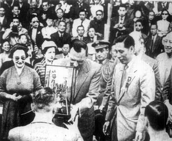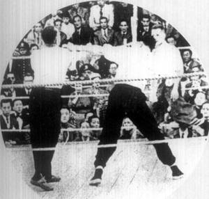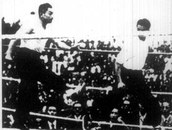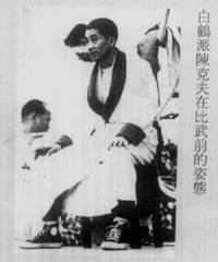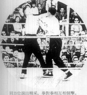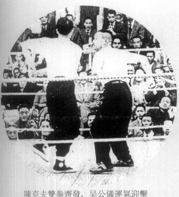 | 全马来亚有精武会十一单位,会员五万余人,曾于一九五三年,五月五日开全马来亚各埠精武代表会议,成立马来亚精武会会长,及各侨商领袖,曾去电澳门总督,阻止吴陈拳斗,乃约而同者,足证事之不应为而为者,有同感焉。  新闻见一九五四年,一月十六日,星嘉坡,南洋商报。并转载于香港岛晚报 马精武体育会电澳门督 ![]() 大会总裁判何贤致词   各位亲爱的观众:今日这个会得如此热闹,首先得到本澳当局之指导,与港澳各名流之后作指导。更多谢吴公仪、陈克夫两老师,与八和会馆各位大老倌热心帮忙,更主要是得到各位亲爱观众之热心支持,如果不是各位观众这热心支持与合作,这次是无法举行的,故此,我现在代表本会向各位以最热烈之感谢。 此次本会之举办义赛,可以说是包含两个意义:第一,系希望筹到一笔善款,来救香港石硖尾火灾之七万同胞。同时捐赠本澳镜湖医院,同善堂之经费。同时我们还有一个意义,就系藉此次这表演来提倡国术。 ![]() 我国之国术,有好几千年之历史,集中无数武术家研究,发展成为世界上最特出之一种体育,但一向难得机会作公开表演。而得到吴公仪,陈克夫两 位名师之热心合作,将国术公开,可以说非常,非常难得之机会,因此,我们一定要十分珍惜这个难得的机会,我们一定要令这个表演由头至尾,顺利完成。将我国之国术好好地介绍出来,使今日到场之观众,一同参考! 为了保证要达到这个目的,除了本人已经得到吴陈两位老师之合作外,更希望今日到场观赛之观众,真诚合作! 吴师傅同陈师傅两位都一致认定这次合演,目的只系研究国术,公开研究,对于谁胜谁败,绝对不介意的。 此次两位才老师系完全为了做善事,为了提倡研究国术才联合表演。 所以:为了保证这次之合演能够在<和平>,<友爱>愉快之空气中顺利完成,除了得到本澳政府当局之指导合作,尤其希望今日场之观众同我实切实合作,希望各位了解这次国术表演之目的,系慈善筹款与提倡国术,并不是较量成败,所以请各位保持镇定,千万不要影响台上表演人之情绪,免致发生任何之意外,就失这次<提倡国术>之意义! 今日到场 之各位亲爱观众,我相信一定能够同我们合作,保守会场之秩序,使 到这次之盛会能够顺利完成,本人谨代表本会首先向各位致以衷心热烈之感谢!同时并代表镜湖医院,同善堂之贫苦病人,及香港石硖尾村受难灾民,向在座各位善长仁翁,多谢,多谢…… 我现在再重复向各位请求: 遵守秩序,发扬体育精神! 保证大会和平,顺利结束! 祝各位健康! 词毕,四时十五分,举行比武,详见报载。 见一月十七日,星岛日报 ![]() ![]() ![]() (本报专讯)一场予人茶余酒后作谈话资料的吴公仪,陈克夫国术慈善赛,昨天终于在二万多对眼睛下实现了,无可否认这是一幕紧张,刺激的<比武>,虽然不能说是代表一派与一派之拳术竞技,但来观的人心里总存着,太极,白鹤哪一派了得的心理,所以昨天新花园里的纸伶歌唱,国术表演,观众注意于后者,前者不过是轻松的享受罢了。   一时敲过,港澳拳者如泉涌至新花园,新马路上的三轮车,汽车如长龙一样。二时敲过,澳督史伯泰夫妇到场,由保贤,梁昌,崔德祺迎入,接着史伯泰夫人主持剪采礼,大会便 正式揭幕了。 各名伶先来一度唱曲娱乐后,便是鉴泉太极社表演,接踵是泰山健身学院学员表演。三时四十分,司仪张瑛在高峰前播出,<吴公仪陈克夫国术合演>场 内空气顿时紧张起来,大会工作人员纷纷在<擂台>上打点。   吴公仪首先上 台,只见他穿深灰色长衫,蓝胶鞋,两个助手跟着,吴氏上台时四边拱手,观众台上报以热烈掌声,坐在一角。接着是陈克夫上台,陈氏穿白色蓝边裕袍,黑胶鞋,两个助手穿黄色衣衫,全部西洋拳师作风,上台后向四边观众鞠躬为礼,台下传 来一片掌声。 吴公仪上台后,见台边之三条麻绳系了白带,对于目力有所影响,遂要求将第一条之白带除去,两拳师继脱去外衣。 ![]() 四时十五分后,大会总评判何贤召集两拳师在台中握手为礼后,当场裁判彦光宣布开赛,电铃一响,吴公仪陈克夫想继离座: 第一回合 只见陈克夫首先用拳向吴公仪面部击后,吴氏微微闪过,亦还拳向其还击,陈克夫一面转弯,又是一拳向吴公仪左面部进袭,吴公仪一躲,左唇被其中击中,面部有血渗出,跟着陈克夫一个<回手>落 在吴公低度之颈部。公仪不留意其有此一着,倒退两步,扑于台上之绳边。陈克夫未有向前袭击。公仪马上恢复反应,一个箭步,就向克夫脸部迎面一拳,中了克夫之鼻,当即左边有血渗出,公仪向其左。中一拳。克夫出击吴,电铃大鸣,宣布第一回合已达法定时间。公仪此时正踢一脚,但公仪马上停止,各坐原座。 ![]() 暂休镜头 这时克夫之鼻血涌出甚多,其两个助手马上用冷水替其浇头,并作全身按摩。本来两分钟休息时间很快就过去,但大会为了这个原因,也稍延长时间。 场内空气因见<血>而紧张起来,总裁判何贤马上跳台上和吴公仪,陈克夫先后慰问,这时他心情之过度性紧张溢于眉表。同时台下不少委员提出停赛的意见,因为怕后果不良。何贤心绪烦乱,连忙挥手急得面也红起来说:"我有主意,我有主意",有人便 问<有没有医生在场边以防不测>。当时大会委员紧张情绪可见一斑。 ![]() ![]() 第二回合 电铃又鸣,宣告第二回合开始,克夫鼻血已经停止流出,两人拳头更密,各作上中路进击,公仪胸部又中了两拳,克夫之肩部及头部亦被击中,且右手伸出时,亦被公仪在其小