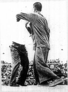 名伶演唱澳门 吴、陈二之拳斗,原由在澳门康乐会筹办,定名曰<慈善比赛大会>,原替澳门镜湖医院及同善堂筹款.及后因香港石硖尾六村火灾,数万灾民急等求待救济,大会乃决定将此慈善比武大会全门券收入,发出百分之四十,救济石硖尾灾民.又以比武在下月十日始举行,而灾民亟待救济,因此由康乐会名义,由太极社理事长陈作新携返香港义与六村急赈会。 一九五四年,一月十七日吴陈比赛举行于澳门之新花园,事前先搭擂台于泳池之上。是日下午二时十五分,澳督史伯泰夫妇到场,由何贤、梁昌、崔德祺迎入,即由史伯泰夫人主持剪彩礼,女艺员方艳芬献花,并介绍公议、陈克夫二人与澳督相见,后由澳督颁赠三皮具鼎予太极拳社、泰山健身学院、八和会馆三位代表后,大会正式开幕。先行依照秩序由各名艺员义务播唱歌曲,各拳社同表演术、剑术、推手,完毕之后。 吴公仪略历 吴公仪,字子镇,河北省,大兴县人,现年五十三岁,为香港鉴泉太极拳社社长。其父吴鉴泉,创鉴泉太极拳社于上海,自为社长,兼精武会太极班教师。民国二六年南来广州精武会,鉴泉之父名全佑,曾任清廷武术教职,公仪一度任湖南武术教官,九一八抗战事后,鉴泉偕公仪,南边来港,遂成立太极拳社于香港。 陈克夫略历 陈克夫,祖为广东省臺山县六村人,出生于澳洲,现年三十五岁。幼时归国,入广州体育学校及培正分校,师邝本夫,学白鹤派拳术,兼擅西洋拳术。抗战任职于香港国民大学,当体育及拳术教师,一九五二年创立泰山健身学院于澳门。邝本夫原师吴肇钟,克夫之艺亦有渊源者。 ![]() ![]() ![]() ![]() ![]() 吴陈比武评议 陈公哲 月来报载香港太极派拳师吴公仪,澳门白鹤派拳师陈克夫,各自宣称其本派拳技之优点,相约较技,甚嚣塵上,其始由研究二字而起,近则已由澳门殷商多人,组织大会,主理其事,双方商定规则,更有采取自由搏击办法订立生死不究之约,在澳门作慈善筹款而举行,余以为不可,兹申论之。 吾国技击,有其精粹,流传至今,忆成专科,而其中宗派,蒸去蔚,各擅其长,自清代群主以技击足以倾覆国祚,遂糟禁锢,边鄙之氓,恃为械斗技能,益增禁锢口实。海外帮会,常有私斗,武馆向不受人欢迎,前此之学习拳术者,每欲一显身手,好勇斗狠,时有死伤,门征啓寡,累及其家,于是相诫毋许研习,拳术日潮 被视为下流末技,枪炮既与,已取代拳术地位,拳术愈趋衰落矣。 清末宣统元年,余与同志数人,创立精武体育会于上海,旨在中兴国术,不以个人为本位,亦不以一家一派为本位,包含之广,为前所无,聘任各派专门教师,不下六十余人,经科学训练后,派赴各会传授。寓拳术于体育,不许斗争,故乃有“不许我之拳头,加于同胞身上”之口号,十年间,远及港澳南洋一带,有二十余分会,学习国术者逾百万人,树立风气,拳术由是人焉。 前此南洋(包括港澳)各武馆,向受当地政府抑制,练习拳术,不敢公然为之,人数不多,当局不甚注意,所用器械、棍棒之外,刀枪剑,向无设备。一九一九年,内地来港介绍精武会,政府日渐明白了精武之提 介国术,乃以体育为目的,非以打斗为能事,于是准予注册,国人遂获得公开操演拳术,而一向蛰伏之各家各派,因精武之关系,亦先后露面,国术蓬勃发展,而有日之现状,非复往时之被禁锢矣。 余维此吴陈之争,虽号称义赛,恐将再开打斗之风。交手之后,必有胜败,从此引起宗派之斗争,重蹈往时武馆覆辙。且未曾确定拳斗标准规则,评判何从依据,而年龄与体重为标准规则之要素,虽能自定程式,不免有若干法纪。况拳术之技能,各派有其妙用,如摔角以摔交为能事,拳击其专长,岂能倒地而判其胜负耶? 日本武术分为三派,即技击术、击剑、角力,各自比武,与异派向不相斗,且悬为例禁,外国之武术比赛 ,在巨量金钱奖励之下,拳击家不异以身体为孤注,有因拳斗而成为终身残废者,有因拳斗而成为终身白痴者,有当场被拳击毙者,故今日外国舆论已起而反对拳斗,有:“合法谋杀”口号,籍以为在今日武术中兴,未至尽量发扬之时,应放弃个人英雄主义。 白鹤,太极,各有所专长,若不尽其所能,则拳斗意义;若尽其所能,即身体损伤,非吾人之所忍见。纵使某胜某败,亦不足以代表某家某派之优劣,从此再开打斗,门徒各拥其师,由拳斗而入私斗,陋弱复兴,谁辞其咎也! 此次比赛,若以击伤身体为胜负,则人道攸关,若以身体倒地为计分,则不够刺激。且购票入场所,观拳斗不逾十分钟,未免有伤欣赏这意义,慈善筹款办法尽多,实不以拳斗为号召也。 (按) 陈公哲先生国术界之老前辈,于宣统元年在上创立精武会,现任中央武术总裁,全马来亚精武总会顾问,前中央国事馆参事,生平提倡国术,足迹遍海内外,精武全盛时,有五十余分会,远及南洋岛及加拿大,国术中兴,此公致力甚大。(照録报载) 四、事前设法之劝止 吴陈二人拳斗虽已签约,然为人道 计,尽余诚心,设法劝阻,分致二函吴公仪,陈克夫二位。 致吴公仪函 径启者:日来阅报知先生与陈克夫先生签订斗决合约,查此次拳斗慈善筹款,原以此比赛为号召,但按照合约内容,实为决斗性质,斗决之事在二十世纪中已不存在,且为一种犯法行为。先生或因溺于往昔武士习惯,有人向忆挑战,若不起应,即为示弱,无怪有此一举,但连日报之反应,想先生亦会见之,依照社会公意,先生宜自动取消决斗改为表演性质,以不务损身体为原则,即社会必不以先生为懦弱。余自办理精武会,提介国术,统集各家各派
