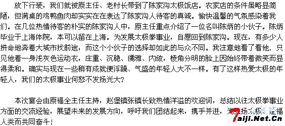 广府西街党支部书记刘新民同志对这次出访做了如下总结:此次出访陈家沟,两天时间受到村、镇、县三级政府的热情款待,温县县委副书记刘同旺同志、政府副县长戚太明同志在百忙中抽出时间与大家见面。原主任,张村长抛开一切事务,全程陪同,这种情谊令我们非常感动。另外,在永年,太极拳运动虽然比较普及,但在对专业人才培养的重视程度方面,温县、陈家沟走在了我们前面。他们的经验值得我们借鉴。太极事业是一项惠及全球的伟大事业,做为陈式太极拳故乡陈家沟与杨、武式太极拳故乡广府的“结亲”,必将推进太极事业的兴旺发达!