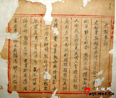 我在唐村考察时,李立炳向我展示了几张老化得几乎一触即破的黄纸,上边写着“太极拳论”。我觉得,这和发现王宗岳挂匾一事一样,仍不失为一个重要的发现。现不妨照录如下: