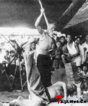 过去逛天桥,提起练武术的朱国全,无人不知、无人不晓。其武功在全国享有盛名。 在今天“天桥乐”北边,就是朱国全表演的场地,上搭天棚,下围板凳,场西边有木桌,上边放朱国全的大照片,两手插胸,肌肉突起,健美非凡。照片后边刀枪林立。在席棚下的高处,有一杆三角杏黄旗,上书:广生镖局,迎风飘荡。他表演时观众总是满满的,不时传出暴风雨般的掌声和喝彩声。 朱国全素有神弹弓之称,从来弹无虚发。他的惊人绝技是:离目标十几步,拉开弓将其兄嘴中所叼的弹丸和耳朵所夹的弹丸击碎,从不伤人,这早已成绝响。 朱国全的气功更是了得,给我印象最深的节目是“气功托刀”、“气断钢丝”、“双风贯耳”和“钉板开石”。气托钢刀是将一把明晃晃的钢刀刀刃儿贴胸,丁字步往那儿一站,运气后,让一名小伙子把三节棍绑在一块儿,往刀背上抡圆了猛打,啪!啪!响声震耳,打得三节棍直掉木屑,打过三五分钟后,朱国全把胸上刀拿开,胸前仅有一道紫痕,一点不破皮。当时三节棍响声、掌声、喝彩声,响成一片,传出很远。 气断钢丝是将四条钢丝绕在胸前,只要朱国全一运气,吼一声开!四根钢丝全部绷断。而他的“双风贯耳”胆小的都不敢看。在表演时,朱国全靠场子东北角侧卧于地下,在他的头下放三块青砖,头上边放七块青砖。让人用大铁锤抡圆了往下砸,随着锤声,顿时头上下十块青砖粉碎,朱国全一个鲤鱼打挺站了起来,面不改色,安然无恙。铁板开石是朱氏的又一绝技:表演时朱国全背躺在百十颗五寸长的钉子上,再在胸部压上一块二百余斤的巨石,由两个人抡大铁锤猛击巨石,只听“砰砰”作响,火星四溅,直至巨石裂开为止,只见朱国全腾身而立,观众掌声雷动。 新中国成立后朱国全参加了北京新华杂技团,并为培养接班人做出了贡献,曾随中国艺术杂技团出国演出,为祖国争得了荣誉。