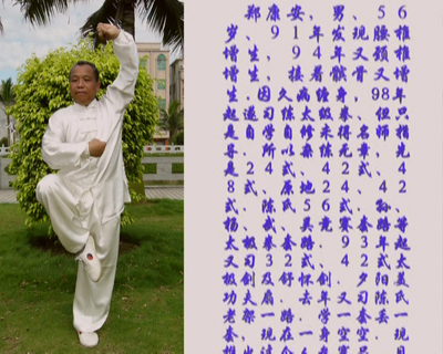 我年青时候家里很穷,快三十了还没找上对象,当时血气方刚,我那小弟弟 老爱发脾气,没法只能捏拧它,直到它流鼻涕,得到那种压迫涨痛感,觉到很欣慰!时间长了,连拉尿也有了这种感觉.有没有对象也就没甚么了.后来村里一位姑娘爱上了我,结婚时我失败了,感觉还比不上拉尿快感,对男女之情也就没感兴趣了。抓紧出外找工作,脱离贫穷,一走就是五年。一九八二年我已是一名农场工人了,就把全家迁到海南。一九八八年又调回遂溪林业局,回来一年后,问题出来了,头痛、腰脚痛,头昏到连眼睛都不敢睁开,腰脚疼到不能上下楼梯,连大便都不能蹲厕了,一定要坐马桶,才意识到身体的毛病严重。那时也了解到太极拳能健身 ,便去买光碟回家自学,刚开始没感到什么,后来练多了,什么样式都练,24、42、48、32等拳、剑、扇,,陈、杨、吴、武、孙五派的竞赛套路都练,后来练到陈氏老架一路,感觉来了,不舒服感有些减缓了,高兴的象小孩子一样跳起舞来,这是对太极拳的爱;可是,后来逐渐逐渐地连我拉尿的那种涨痛快感也没了,这肯定也是练拳消失的,产生了一点怨气!这算是我对练太极拳的“恨”了。 陈式太极拳是目前人们最喜爱的健身项目之一。陈式太极拳是依据“阴阳之理、中医经络学说及导引、吐纳术,综合武术技术创编而成的。因此,练习陈式太极拳可以平衡阴阳,疏通经络,调节神经,全面提高人体的各项生理功能,从而起到防病治病、健身的作用。可以说,陈式太极拳的防治疾病、健身的功效直接来自于陈式太极拳的动作本身,陈式太极拳的动作要领是:立身中正、虚领顶劲、沉肩坠肘、以腰为轴、肢体沿弧线运动;劲力要求是:缠丝劲要节节贯穿,周身一致.因为人的中枢神经就是贯穿于脊椎中间从大脑连接于肢体各部,如果颈椎、腰椎、尾椎相对拉长、舒展,神经传导就会更加通畅,大脑和肢体的神经反射速度就会加快。颈椎和腰椎疾病大多是由于相邻的椎间盘长时间处于受力不均的情况下造成的,陈式太极拳的动作就能使颈椎、腰椎、尾椎相对拉长而变得舒展,颈椎、腰椎的间盘之间趋于平行,相互受力也会趋于均衡,再加上“以腰为轴”的螺旋运动,就会改善它们之间的血液循环.再是 “立身中正、虚领顶劲、沉肩坠肘”,颈椎、腰椎、尾椎被相对拉长的同时,我们的胸、腹腔也相对扩大,胸、腹腔内的心、肝、肺、脾、肠、胃、肾等内脏器官就会处于相对原始的状态,“以腰为轴”的旋转运动,再加上腹式呼吸,丹田的旋转,牵动全身,也就是说:”一动而无不动”.就会对这些脏器起到按摩作用,从而使各个系统的功能得到改善,因此也就达到了防病、治病的健身效果。在陈式太极拳中,弧线的肢体运动和螺旋式的“缠丝劲”相结合,使劲力节节贯穿于周身各部位,终达梢节。大家练功时都会感到指尖发脹就要爆裂一样吧,可能是因为以意领气气催全身的血液循环加快,加速血液供氧以及加快微循环代谢的结果吧!练拳时只会出汗,甚至会大汗淋漓,但不会气喘嘘嘘。这也是说明是血液循环供氧加快、微循环代谢加快并通过汗液把代谢物排出体外的结果,这就是陈式太极拳防病、治病、健身的一个具体体现。 陈氏太极拳螺旋式的圆形动作,能使全身各部分肌肉和肌肉纤维都运动起来,加强肌肉收缩力,使肌肉均匀丰满,柔韧而有弹性。全身各个关节也都得到多方位的幅度较大而柔和的活动,关节和骨骼受到肌肉的牵引而旋转,收紧,起到自我按摩的作用,有助于骨骼的强健,使全身的关节骨骼得到锻炼,从而达到健骨康复的目的.我在八十年代末发现颈椎、腰椎、膑骨增生,全身关节发僵酸痛,气候变化时,酸痛的感觉更重,两腿发软,走路没有力气,斜坡下不了,方便需坐厕,连自然坐在地板上都不能,有时勉强坐下也不自如,想起来也不能,必需用手撑地把屁股翘起半天才能站起.遂开始练习起太极拳来,先是24式,42式,48式,32式,再是陈杨武吴孙氏竞赛套路,32,42式剑,特别是练了陈氏老架以后.我经过练习陈氏太极拳的螺旋缠绕、折叠旋转、圆形动作的锻炼,效果特别好.练习时用意识来以意导动,放松关节,以腰为轴,腰松沉直竖,用腹呼吸,利用腹肌转动,微微旋转腰部,带动胸背肌肉亦随之转动,四肢缠绕圆转,胯根松开,骶骨沉着,提肛敛臀,膝关节始终保持微屈,腿部弧形转换虚实,由胯关节和膝关节旋转来领导着做顺旋圈和逆旋圈.做到内外三合,配合一致划弧线圈.发劲由脚至腿至胯至腰至脊至肩至臂至肘至腕至手指,节节贯串完整一气呵成,也就是说“劲起于脚行于腿,主宰于腰发于梢”. 这样柔刚结合地练习,使关节锻炼得更为滑润而稳固,并使骨与骨之间能够更好地分担重量,从而增强骨质和耐力,使全身的骨骼及关节和各部位的肌肉和肌肉纤维,做到一动无有不动,使全身的关节和骨骼,得到了均匀而柔和的锻炼。使胯关节和膝关节及全身骨骼受肌肉和肌肉纤维的牵引,更加灵活而强壮起来。从而达到健骨康复。现在 ,我各部位僵酸痛越来越小,我的身体舒畅,走路轻盈,弹跳自如,不过膝盖还是有一点痛,奇怪的是,打起拳来没感到痛,这就是陈氏太极拳的神奇吧! 我练习太极拳到现在,逐步地对拳理的理解和对太极拳的练习对身体健康的自我感受.理解到我拉尿时逼迫的痛快感也是病,一种原病叫前列腺病.另一种把拉尿的痛苦当成快感也是一种性变态的精神病. 前列腺病多有气机不畅、气血