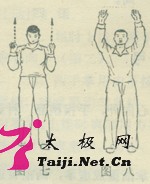 1,两拳逐渐松开,掌心向上,两臂柔和地向上直举,眼随,两掌上举而向上看(图八)。 2,两手逐渐下降,下降时掌渐握成虚拳,手指稍用力恢复成预备姿势。上举时吸气,下降时呼气。 [作用] 霸王举鼎可发展肩部肌肉力量,对肩关节的上举、下降、内旋、外旋的功能恢复有帮助,配合“白马分鬃”对肩关节周围炎及肩关节粘连有防治作用。这部分动作还能帮助胸廓和肺部的扩张,使呼吸加深,肺活量增加,加强氧的吸入与二氧化碳的排出,帮助气血运行。不仅如此,呼吸与运动的影响还可提高心血管系统的功能,对动脉粥样硬化以及高血压、心绞痛、心肌梗塞、脑动脉硬化等有防治作用。对冠心病患者,通过锻炼能使心内血管扩张,血流量增加,建立“侧枝循环”,对狭窄和阻塞的血管周围搭起无数条小“桥”,起到代偿“支援”作用。