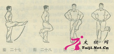 十九、四面摆莲(四面摆踢) [动作] 1,先将左腿大腿提起,小腿垂直,然后将左脚向前踢出,脚尖伸直,脚面蹦紧。 2,左脚落地,右腿提起,右脚向前踢出(图二十七)。 3,右脚落地,左脚后踢,脚跟以触及臀部为度。 4,左脚落地,右脚后踢(图二十八)。 5,右脚落地,左脚向里横踢,似踢毽子一样(图二十九)。 6,左脚落地,右脚向里横踢。 7,右脚落地,左腿抬起,左脚向外横踢,亦似踢毽子一样(图三十)。 8,左脚落地,右脚向外横踢。以上八式分四组进行练习,即先做1、2,重复八次后再练3、4,然后再练5、6,最后练7、8。向前、向里、向外踢腿,均以踢平为度。踢起时吸气,落下时呼气。踢腿不必过分用力,上身挺直,眼看前方,不要低头。 [作用] 四面摆莲是以练髋、膝、踝关节为主的动作,有防治足膝痿软、骨质增生、屈伸僵硬,行走乏力等作用。还可辅助治疗髋、膝、踝关节筋骨酸痛、风湿及损伤后遗症。一般腿部骨折损伤经过石膏等方法固定后,可做这些动作以恢复下肢功能。四面摆莲对发展大腿肌、小腿肌、踝关节力量有独特的作用。内脏下垂者可选行者下坐配合幼鸟受食、大鹏压嗉、风摆荷叶等动作进行锻炼。常练腿功对老年人有防治腿力衰退、步履沉重及抵抗衰老的作用。