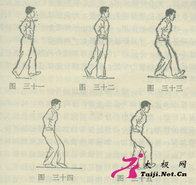 二十、仙踪徘徊(虚实换步) [预备] 立正,两手叉腰。 [动作] 1,左脚向前一步,脚跟先落地(同三十一)。 2,右脚再进一步,重心移向右脚,左脚脚跟提起(图三十二)。 3,右脚后退一步,脚尖先落地,重心移向右脚跟,左脚脚尖提起,脚跟着地(图三十三)。 4,左脚脚尖落地,右脚前进一步,左脚再前进一步,脚尖落地(图三十四)。 5.左脚后退一步,脚尖先落地,重心移向左脚,右脚尖提起(图三十五)。每上一步或退一步时呼吸一次,上身挺直,眼看前方或前下方。脚尖脚跟提起时都必须尽可能向上,使小腿肌、跟腱蹦紧。 [作用] 仙踪徘徊——能舒展小腿、足、踝等肌肉、肌腱,使步履轻健,还能防治小腿麻木酸痛、痿软乏力。本式在饭后单独练习时可起到饭后百步走的作用,对坐着工作的人尤其相宜。也可作为练功后的整理动作。