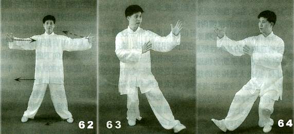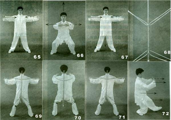 动桩练习 动桩练习是指原地重复性的单练动作练习,要求练习者在动态的条件下保持太极拳身法调节要求的练习方法。由于这种练习动作简单和重复,练习者可以集中精神去体会太极拳身法调节的内体感觉。  升降开合练习 预备姿势:两脚开立略比肩宽,脚尖向前,“命门”微后撑调节好主弓,“开胯圆裆”,两膝微屈与“命门”对拉,“含胸拔背”带动两臂侧平举,手心朝前用意与“命门”对拉,胸、臂连成一大弧形如拥一大圆柱子于身前(图65)。 动作一:“命门”与两膝前后对拉,与两脚底之间对压,“开胯圆裆”重心下降,两膝屈曲蓄劲,主弓垂直中正。同时两肘关节在“命门”与手对拉拔长的前提下,向下向外微弯曲变形调节,两掌心与胸相对,两中指相对轻触成封闭式抱球状,成腿屈手合的动作(图66)。 动作二:“命门”与两脚底上下对拉,重心上升,同时两臂向两侧打开,两手与“命门”成直线趋势对拉,回复预备姿势(图67)。