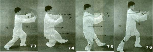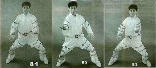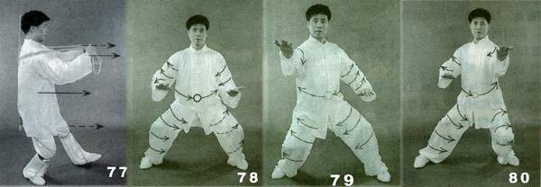橡皮筋辅助练习(图68—74) 取一约与躯干等长之短棍,根据“命门”与“大椎”的位置各系一条橡皮筋(图68),将短棍置于背后腰脊,系于“命门”处的橡皮筋经胯后、膝前设一固定点,踏于脚底保持一定拉力。系于“大椎”处的橡皮筋经肩后、肘关节(设一固定点)拉于手上保持与主弓的拉力(图69)。重复动作一和动作二(图70、71)。  进退开合 动作一:右脚尖外撇45°,重心移于右腿上,“命门”与右脚底对压,“开胯圆裆”沉胯屈膝下蹲,左脚提起向前迈出一步,脚跟轻着地与“命门”对拉成虚步。同时两臂上举,掌心朝内,两中指相互轻触成抱球状(图72)。 动作二:重心前移,“命门”慢慢与前脚底对压,屈膝蓄劲,“命门”同时与后脚底成直线对拉,膝微屈成弓步。同时两手经“大椎”与“命门”对拉向前向两侧伸开(图73)。 动作三:重心后移,“命门”慢慢与后脚底对压,屈膝蓄劲,同时与前脚底成直线趋势对拉,前脚脚尖提起成虚步。与此同时两肘下坠弯曲,两臂回收,两中指轻触于胸前合抱成圆(图74)。 橡皮筋辅助练习(图75一77)  抽转缠丝练习 预备姿势:两脚开立略比肩宽,脚尖向前,“命门”调节之力与五弓联系,下行“开胯圆裆”屈膝下蹲成马步,上行通过“含胸拔背”、“沉肩坠肘”使两臂举于胯前,右掌心朝下,左掌心朝上(图78)。 动作一:腰脊主弓左转,带动右腿绕本身轴内旋,“命门”与右脚底螺旋对压,右膝螺旋前屈,左腿绕本身轴外旋,“命门”与左脚底螺旋对压;右臂随主弓转动之力绕本身轴外旋前伸至肩高,掌心转朝上,左臂同时绕本身轴内旋回收至腰侧,掌心转朝下(图79)。 动作二:腰脊主弓右转,带动左腿绕本身轴处旋,“命门”与右脚底螺旋对拉,同时左臂随主弓转动力绕本身轴外旋前伸至肩高,掌心转朝上,右臂绕本身轴内旋回收至腰侧,掌心转朝下(图80)。 动作一、动作二重复进行。橡皮筋辅助练习(图81—83)  检验方法:前面已介绍过各弓的调节要求和方法及检验手段,五弓合一的练习方法主要观察五弓调节的协调性,并可同时施加压力于上、下肢弓,以检验在动态过程中四肢弓与主弓之间的弹性联系。(完)