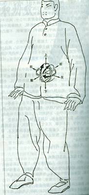 第八式:左右云手 左右要分虚实,如右云手时,向右划弧形时是“阳”,为“虚手”,手心向里,“虚中有化”,“化中有棚”,大拇指靠拢食指,中指带动四指,松沉肩、肘,圆弧形向右向下圆弧形转动,内气由指、腕、肘、肩,进脊背,通向左手由肩、肘、腕、指。左手是“阴”,为“实手”,大拇指与食指要撑开撑圆,坐腕掌心向下指尖微向西南,左右手在运转中分清虚实。两足分虚实,右手虚,右脚为实,左手实,左脚为虚。如跷跷板运动,右脚实时,要松胯下沉,左脚提膝脚尖向下活动踝关节,这是两足的分清虚实。前胸是“阳”为“虚”,背是“阴”为“实”,这是前后的分清虚实。随着腹球(3—4图)左右转动,肩平、胯平、目视前方关着双手。左云手时,方向相反动作一样。 重点练:处处有虚实,上下左右前后分虚实。
