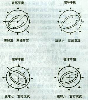 第十三式:左右双峰贯耳 先师傅钟文老师常讲:在练拳时要注意“如意胳膊箩筐腿”。“如意胳膊”指的是两手臂,练拳时两臂无论“伸展”或“收缩”,或“左右运转、上下运转”,“伸而不直”,“缩而不弯”,微有含蓄,两臂好似古代当官上朝时手托的朝板。“箩筐”农家都有,是盛放农作物用的竹制箩筐,上圆下方,古人应用于拳术之中,值得探讨。 举例一:“双峰贯耳”,从右蹬脚转“双峰贯耳”。先做沉肩坠肘,左脚内扣45‘,双手随转各自左右弧形移至胸前,随移随着曲肘和臂外旋使掌心翻朝里面上方,两肘下坠,两臂成弧形,此时两臂做好“如意胳膊”,不宜太直。太直了,如对手向你双肘截击,势必自打耳光。不能肘弯,及肘不外扬,如果肘弯了,腹球自瘪,必出棱角,均不可取。在此运动中,运用腹球(5图)同时运用“三沉”。破坏腹球平衡,使两手弧形下沉后撤。“左腿为实”,右腿提膝“为虚”。脚尖下垂(活动踝关节),两手下沉于右膝左右(俗称武松脱铐),继做“三沉’,输送右腿,此时做腹球(6图)恢复平衡,两手弧形渐渐变拳运至东南正前方,两拳稍高于头,两虎口相对,两拳距离20公分,两肘不能外扬,两拳不能握得太紧,又不难松懈,大拇指握中指,成右弓步。此时要两肩平,两胯平,不能前俯,不能凸屁股,不能后仰,眼视正前方。 要做好“双峰贯耳”,上肢靠“三合”(意合、胸合、裆合),下肢靠“起于脚发于腿主宰于腰形于手指”。通过“内气”将箩筐腿撑开撑圆(要自然不用拙力),达到劲贯双拳。箩筐腿的作用是关键,如果没有箩筐腿的协助作用,诚恐难能如愿,达不到此境界。 箩筐腿的作用与部位,它是整套拳路中不可缺少的活动部位。如做“起于脚发于腿主宰于腰形于手指”,首先要做“三沉”(沉肩、沉胯、沉膝),从腿外侧下沉,要外棚(裆能自圆,否则产生尖裆),左腿经过三沉后如树根人地,有一股反弹力通过“涌泉穴”至腿内侧上升,经过踝、膝、裆、会阴、命门、脊背至双手,中间经过裆、胯、臀、腰部位时,裆部由小腿外棚劲撑开,其他部位放松,命门后撑,由“内气撑开、撑圆”,辅助腿劲贯顶。裆、胯、臀、腰要相互呼应,互相贯注。凡后蹬之腿亦要微曲,不能挺直,留有回旋余地,这属箩筐腿。练习太极拳,有人认为难学,高不可攀,其实它有一定规律,设法找到规律,顺着规律去练,必能提高兴趣。太极拳纵横交叉,错综复杂交织在一起。腹球运用可以随心所欲。进一言,要“静思悟拳”。 重点练:轻灵、圆活。