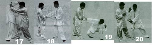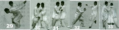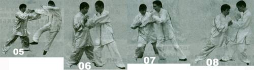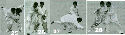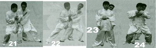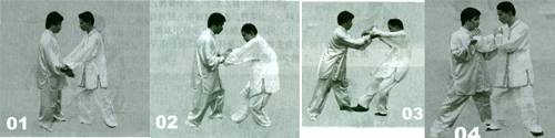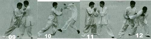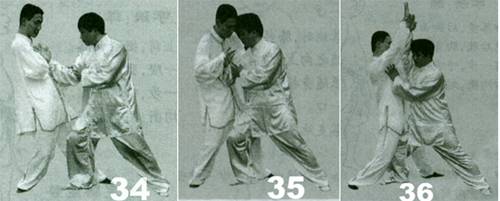 ![]() 二、金刚三大对 (1)甲方右脚上步,用右手(或掌或拳)向乙面部或胸部击打。乙双手接其手、肘,并用左脚进步控制对方右脚。若甲方欲退,乙用棚劲顺势将甲发出(图4、图5)。 ![]() (2)甲方用右手、肘进攻乙。乙则右胯松沉,腰轴右转,两手粘随甲方右臂向右后捋,使甲方来力落空倒地(图6、图7)。 (3)甲方落空欲退。乙粘随甲方并用左手及前臂挤击(图8)。 (4)对方侧身并后坐走化来力。我则顺势双手合力按击(图9、图10)。 ![]() 三、懒扎衣 乙右手接甲方右手引化时,甲方以右肘击乙。乙左手顺势向顺时针方向裹缠走化,并两掌合力采甲右臂(图11、图12)。 甲方两手采乙右臂,乙顺势抬肘走化,并用左掌向下翻旋按击(图13、图14)。 四、自鹤亮翅 ![]() 甲方右手看乙右手,左手看乙右肘进步推按。乙两臂放松,左脚向后撤步化力,并顺势捋甲(图15、图16)。 乙右手搭甲右手,左手看其右肘,挤按对方。若甲走化乙则顺势埒之(图17)。 ![]() 五、斜行 (1)甲右手握拿乙右腕,左手裹缠乙右肘。乙以左手按压甲右手指,右掌上旋扣甲右手腕,右肘内旋;左手与右手形成合力向外旋压,反其腕关节(图18、图19)。 (2)甲左手握乙左手,右手臂缠乙左肘,合力采拧。乙左肩放松,肘内收引化,同时,左腿向左上步套甲双脚。甲失重欲退,乙身体左转以肩肘击甲(图20、图21、图22)。 ![]() 六、伏虎 甲从背后搂抱乙双臂和身体。乙两臂上拥,身体蓄沉解其搂抱,两臂上棚时,两手扣甲双手腕;松胯,身体右转,使甲从右前跌出(图23、图24、图25)。 七、倒撵猴 乙左手粘引甲左手,右手向内、向下裹缠甲左臂;同时右脚跟向后上撩甲小腿,以断其根,上下合力使甲仆倒(图26、图27)。 ![]() 八、闪通背 甲用右手(拳或掌)迎面击乙。乙右手粘接甲手腕引化,左手接甲右肘裹缠右臂;同时右脚撤步,身体右转,向右前闪摔,使甲仆倒(图28、图29)。 ![]() 九、高探马 (1)乙右手送出甲右手,左手接甲左手,左前臂搭甲右肘部,上步挤按,使其向后倒地(图30、图31、图32)。 (2)乙右手送出甲右手,左手接甲左手,左前臂搭甲右肘部挤按;甲顺劲走化时,乙两手合劲向左前埒按甲左臂,并用左脚勾甲右脚,上下合力使其侧倒(图33)。 ![]() 十、野马分鬃 甲采捋乙右臂,乙旋肘走化,并顺势右脚进步插裆,右臂外展发放甲。甲顺势走化乙劲;乙右手臂顺其势以肘击甲。甲向右上捋乙右臂走化肘击;乙顺势向右转身,两手合力向右侧发甲(图34、图35、图36)。 |