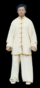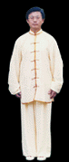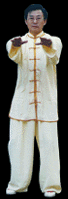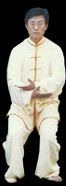 动作七: 练习方法:双掌慢慢下落至两腿外侧,掌心向下,掌指向前,眼向前平视。