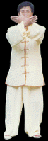 动作四: 练习方法:双腿慢慢直立,成开立步,双掌交叉合抱上举于体前,右掌在外,腕与肩平,成斜十字型,双掌心向内,眼向前平视。