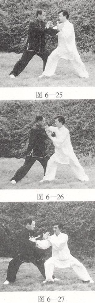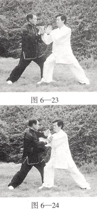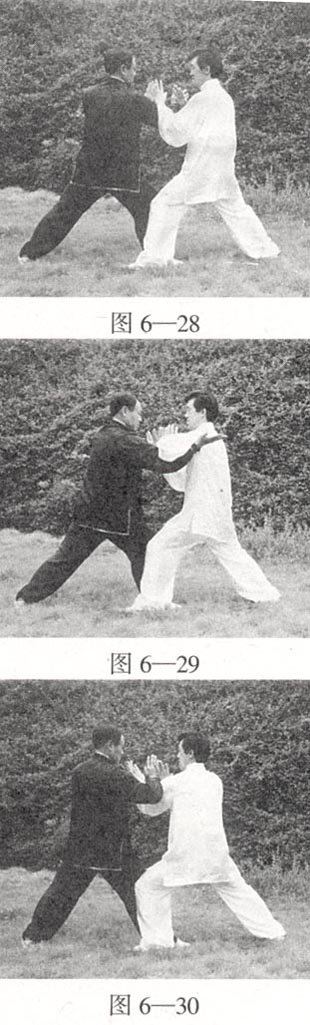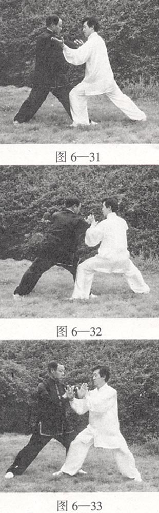 | 顺 步 推 手(一进一退) 甲乙双方相对站立,甲方提右腿上步成右弓步,同时伸右臂绷起,右手立掌高与肩平。左手立掌轻抚于右肘内侧。乙方提左腿上步于甲方右腿外侧,同时抬起双臂,左手腕轻贴对方右肘关节外侧,右手腕接对方右腕关节。甲方左手置于乙方左手腕外侧。重心均在前腿,目视对方(图6—23)。 甲方右臂向右前方用挤劲缠绕;乙方身体下沉微左转化开甲方挤劲后,双手按住甲方左手和左肘。此时甲方重心在前,乙方重心在后,甲乙双方目视对方手臂(图6—24)。 乙方重心前移,用双手按对方。甲方重心后移身略左转,用上履劲将来劲走空,乙方随即沉肘松肩变挤劲绷 住对方右臂(图6—25)。 上动不停,甲方重心前移,其右手按对方右手,左手按对方右肘,向前按出后变侧身,以右手为主,向前按并外挤;同时左手抚于右臂内侧以助其势。与此同时,乙方身体向右转,重心右移,双手臂缠对方右手臂向下履,甲方随着乙方的下履身向下沉(图6—26、图6—27) 接上动,甲方右手臂外翻上绷,重心后移,提右腿后倒一步,左手臂随之贴于对方右肘外侧。与此同时,乙方随甲方外翻上绷 倒步,用右手臂绷住劲,重心前移,提右脚上一步于甲方左脚里侧,左手臂随之抚于右臂内侧与甲方左手相合。目视对方(图6—28)。 接上动,乙方用挤劲以右臂向前方缠绕对方左臂,绷住左肘,左手接甲方左手腕变履劲。甲方双手臂缠绕后按于乙方左手、肘。此时乙方重心在前,甲方重心在后(图6—29)。 上动不停,甲方重心前移并用双手按对方;乙方重心后移,身略左转,用上履劲将对方履空;甲方随即沉肘松肩,用挤劲缠绕乙方左臂, 住乙方右臂变履劲(图6—30、图6—31)。 接上动,乙方重心前移,双手合住劲按甲右手右肘,按出后变侧身,以右手为主向前按并外挤,左手抚于右臂内侧,以助右臂之力。与此同时,甲方身体向右转,重心右移,双手臂绕住乙方右手臂向下履 ,目视对方(图6—32) 上动不停,乙方随即身体下沉,右手臂外翻上绷,重心后移,提起右腿倒一步,左手臂随之轻贴对方右肘外侧。与此同时,甲方随着乙方的上 绷和倒步,用右手臂 绷住劲,重心前移,提起右腿上一步于乙方左脚内侧,左手臂随之抚于右臂内侧与乙方左手相合。目视对方(图6—33)。 此种练法一进一退为一圈,甲乙双方各一左一右,平衡圆转,均包含有绷 、履 、挤、按、采、列 、肘、靠八种用法,以及脚、膝、胯等部位的套、管、粘、黏等法。反复练习,奥妙无穷。其特点是: 绷履挤按须认真,上下相随人难侵。一进一退步灵活,肩肘胯靠显神威。 右势练熟后可练左势,左右势动作、要求相同,惟方向相反。 ![]() ![]() ![]() ![]() |