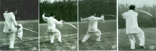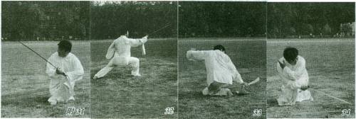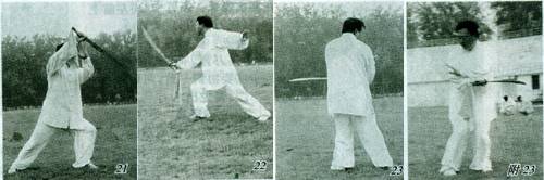 ③左脚上前一步虚点于右脚前,右腿屈膝松胯下坐蓄劲,左手扶刀背。上动不停,右腿蹬伸,左腿前跨一步呈左弓步。同时,上体左转,两手向右前上方推刀。目视前方,定势面向东北方(图29、30)。 要点:弓步推刀前,刀要在身体左旋右转下迥环自然。推刀时要顶头竖尾,气向下沉,意贯刀刃。 2.平沙落雁(抱刀前刺) ①接上势,左脚尖外摆,右脚跟抬起外拧,两腿屈膝呈坐盘步。同时,上体向左拧转。右手握刀甩腕向左后下方刺,刀尖回环向前甩起;左手随动与右手合抱于胸前。左手在内,右手握刀在外,刀刃朝外、刀尖斜向前上方。目视刀尖前方,定势面侧向东方(图31)。 ②左脚蹬伸,右脚向前跨步呈右弓步。同时右手握刀前刺,刀刃向左、刀尖向前;左手向后展开按于左胯后方,指尖向左,手心向下。目视前方,定势面向正东方(图32)。