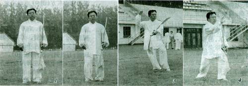 武派太极连环十三力,是当代武派太极名家吴文翰先生将武派太极传统十三刀及四刀法,在太极拳理指导下结合刀术之实践用法综合而成。演练时既有连绵缠绕、舒展洒脱、劲意不断之太极风韵,又有刀势凌厉、霍霍如风之霸气,运用时因敌变化、不拘成法,以静伺动,轻灵敏捷。连环十三刀既可练功又可表演,因此深受太极拳爱好者之欢迎。 笔者自幼习武,先后受业于清末太极拳巨擘郝为真宗师再传弟子陈固安、吴文翰二位先生.习武派拳艺40余年,应《少林与太极》之约,先后在该刊发表了武派太极拳架、打手集锦、抢、剑、棍等。今将师父吴文翰亲授之刀术,整理如下,供读者研究学习,因水平有限,欠妥之处尚请读者指正。 预备式: 面向正南方,摒除杂念,气敛神凝,周身放松,两脚自然站立。左臂微屈稍向身前,左手拇指在上,其余四指在下,握宝刀把。刀尖朝上,刀刃朝前,刀背贴臂膀,直竖向上,右手自然下垂,两眼平视前方,有欲动之势(图1)。 要点:悬顶、微收下颏,身体保持自然中正,两臂自然松沉,胯根微收,臂部前送,双膝里合,摒除杂念,精力集中,气舒神畅,气纳丹田。 一、按刀 1.搂膝探掌 ①接前势,两臂手心向内,下沉圆撑(图2)。身体微向下屈蹲,右脚向右稍移,脚尖内扣,左脚虚点于右脚前,身体右转呈右实左虚步。同时,右手由下向上提于右耳旁,掌心斜向前下方,左手握刀由外向内揽抱于胸前,刀斜置于左臂之上,刀刃朝外,目视前方,定势面侧向东方(图3)。 ②身体左转,右腿蹬伸上左步呈左弓步。同时,左手握刀自胸前下搂至左胯前。立刀,刀尖向上,刀刃朝外。右手自脸前坐腕按出,立掌指尖向上,掌心斜向左前方,目视掌打前方,定势面向东方(图4)。