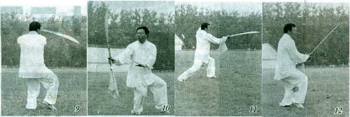 ②上动不停,左脚尖略外摆,重心前移落于左腿之上。右脚随即跟上虚点于左脚前,上体左转。同时,右手握刀自右下方向左前方撩劈,刀刃朝上方,左手随动护于右手腕处,目视刀前方,定势面侧向东方(图9)。 ③接上势,右脚向前一步,脚尖外摆,屈膝落胯,重心移于右腿。左脚随即跟上一步,虚点于右脚前。同时,身体右转。右手握刀甩腕翻刀,刀尖自下向右后方撩劈,刀随势翻起,刀尖朝上方,刀刃朝后方。左手下落护于胸前,目视刀身,定势面侧向西方(图10)。 ④上动不停,身体略下蹲,左脚向左前方一步,右腿蹬伸呈左弓步。同时,上体向左转。右手握刀下落翻刀向左前上方撩刷,左手在胸前画弧;屈臂手心外翻,棚于头左前上方,目视刀前刃,定势面向东方(图11)。 要点:震脚崩刀、沉气抖腕,要一气呵成,力贯刀背。向左、右撩刀时,刀随身走,刀势步法要协调一致,两臂运作,圆活自然。 二、青龙出水 1.立刀里裹 接上势,左脚不动,右脚向前一步,虚点于左脚前,呈右虚步。同时,上体先向左转再微右转。左手下落与右手相合捧刀里裹,刀尖向上,刀刃向左,斜置于身前,目视刀身,定势面侧向东南方(图12)。