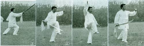 要点:裹刀要松腰落胯,丹田处向内吸劲,裹劲要有外撑之意,抱刀时肩肘要松沉,腰的左转右旋与抱刀要协调一致。 2.探刀前扎 接上势,左腿蓄劲蹬伸,右脚向前一步,沉腰落胯呈右弓步。同时,两手前后展开,右手握刀向前扎,刀尖向前上方,刀刃向左方,左手展按于身后,呈助前扎之势。目视刀扎前方向,定势面向东南方(图13)。 要点:向前扎刀,右手臂向外旋拧伸出,力达刀尖。弓步与扎刀要协调致,整个动作要连贯沉稳。 三、风卷残花 1.平分秋色(弹步下扫) 左脚向前弹步,右脚提起,松腰落胯蓄劲呈左独立势。同时,左手前移,右手握刀回撤,合于胸前,左手在内,右手在外。随即两手同时展开,右手握刀下劈于右胯旁,刀尖斜向前下方,刀刃向下;右手向上棚起,肘圆撑,左手心朝头左前上方。目视前下方,定视面向东南方(图14)。 要点:左脚向前弹步,右脚抬起与扫刀要流畅自然。独立步左膝关节屈蓄松沉,右腿提膝高与腰平。 2.缠头藏刀 ①上动不停,右手握刀甩腕,刀尖向下、向后,绕至头右上方,左手自上而下按于右胯旁,手心向下。同时,身体长起呈左独立式。目视前方,定势面向东南方(图15)。 ②左腿蹬伸,右腿向前落步,脚尖稍内扣,呈右弓步。同时,右手握刀缠头自左肩下落,左手向胸前抬起与右手相合,右手在外、左手在内。右手握刀下拉置于右胯旁,刀尖向前、刀刃向下;左手自胸前推出,手心向前,指尖高与口齐。目视前方,定势面向东南方(图16)。