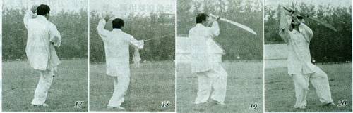 要点:缠头刀背围脖而走,弓步拉刀要沉稳圆活,松腰塌胯,上体正直,左掌指领起,劲贯劳宫穴。 3.搂膝斜刺 右脚向内碾地蹬伸,左脚抬起向前落步呈左弓步。同时,身体左转约90°,左手搂膝向上棚起于头左上方,手心斜向上方,右手握刀前刺,刀刃向左、刀尖向前,高与胸齐。目视前日方,定势面向东北方向(图17—18)。 要点:上体左转与弓步前刺要协调一致,劲贯刀刃。目随势运,意远劲长。 4.护身推刀 ①接上势,先向左转体,左脚尖略外摆,重心前移落于左腿之上,右脚随即跟上虚点于左脚前。同时,右手握刀屈臂向上撩于头左前方,刀刃向上、刀尖斜向前下方,左手收回护于右手腕旁。目视前方,定势面向东北方(图19)。 ②上动不停,身体向左转约90°,右脚向右一步,脚尖外摆,重心移于右腿,左脚随即跟上虚点于右脚前,松腰落胯呈左虚步。同时,右手握刀,刀刃向外滚翻,自胸前护身拉起至头右侧上方,刀刃向上,刀尖向前下方,左手随动护于右手旁。目视前方,定势面侧向东南方(图20)。