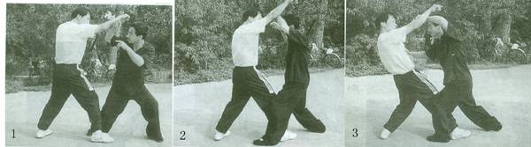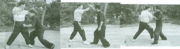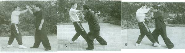 2.练法要求:甲方用右手接乙方的右手前臂时不可用拙力,应用意,换手动作要连贯,转体上步要快,收式蓄劲合为吸气,击打时为呼气,整体力击之。 二、抄手托肘指裆捶 1.动作说明:当乙方用右直拳向甲方头部击来时,甲方成右虚步沉式,用右手腕接乙方的右手前臂(图4)。同时下式上右脚埋住乙方右脚换左手托乙方右肘腾出右手变拳击打乙方裆部(图5)。甲方顺劲牵引乙方或直接下式托肘转体,右左拳击打裆部和胸部(图6、7)。左右式用法相同。