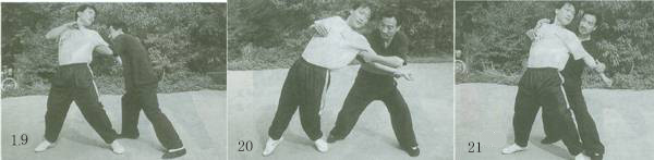 2.练法要求:托肘下式不丢顶,进身转体上步要快。侧身大捋右脚重心要稳,膝打要准用合力。抽身掖拳要协调,弓步转体要自然。进身靠紧向外合,右弓步成整体之力。 六、挒捋并用法 1.动作说明:当乙方用左直拳向甲方头部击来时,甲方上右脚,用右手接乙方左拳内侧的腕部,侧身成右弓步出左掌击打乙方胸部(图18)。甲方抽回左手例到乙方左臂肱骨处,右手下带乙方左手臂,身体外侧重心外移右手配合左手例住乙方左臂外放(图19)。顺势转体回身捋之,成左弓步,双手合住乙方左臂继续下带,使乙方向前倾斜丢去重心(图20)。如果乙方没有完全失去重心,甲方左手锁住乙方左臂,转体上步到乙方身后,右手后带乙方右肩或锁颈、喉,使乙方失去重心(图21),右式可换成左式,用法相同。