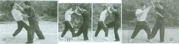 2.练法要求:接手时心要静,以意在先,换手托肘时不顶不丢摸准劲走,手脚并进要和谐,转换移动速度要快,劲收敛脊骨之内,合为吸气,发放击打为呼气。出拳稳准、意、气、力同到。 三、捋挤迎面掌 1.动作说明:当乙方用右直拳向甲方头部击来时,甲方用右手接乙方的右手前臂,成左虚步(图8)。甲方意捋乙方右臂,进身上左脚到乙方右腿外侧,右手换左手拍挤乙方右臂肘的尺泽穴(图9)。同时身体重心在前,右手击打乙方面部(图10)。右式可换成左式,用法相同。