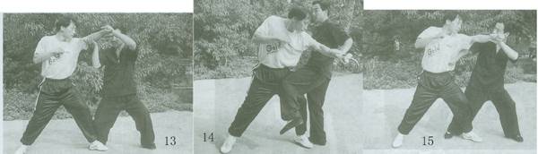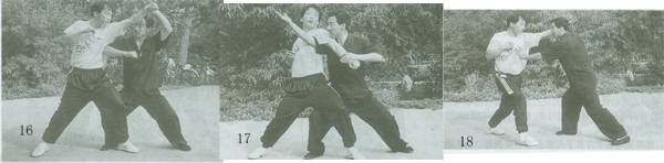 五、捋打摔跌法 1.动作说明:当乙方用左手直拳向甲方面部击来时,甲方左虚步上右脚埋住乙方左脚成马步,右手托接乙方肘关节,左手接在乙方左手腕部(图12)。甲方双手捋下乙方左臂,同时提起左膝击打乙方裆部(图13、14)。顺势抽出右手变掖拳击打乙方左肋(图15),或抽出右手变肘击打乙方左肋(图16),再或右手伸出至乙方左腋下,左手下带乙方左臂,使乙方向后摔倒(图17)。右式可换成左式,用法相同。
