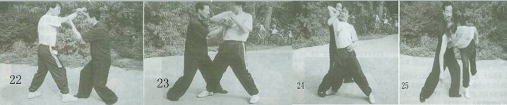 2.练法要求:甲方侧身接乙方左手,不可用力,左手意打乙方前胸。甲方变换手法要快,动作协调,双手合住乙方左臂,劲要整。向外转体速度要快,劲不丢、力不断。甲方锁住乙方左臂,前胸贴住乙方左肩,右手带乙方右肩时,身体下沉向外转体成左虚步,胸和肩必须脱离。 七、捋拿摔法 1.动作说明:当乙方用右直拳向甲方头部击来时,甲方成左虚步,右手接住乙方的右手腕,左手托住乙方右肘(图22)。甲方右手下带内合乙方右手腕,左手上托乙方右肘,同时转身上左脚到乙方右腿外侧(图23)。甲方右手带乙方右腕上走肩部,左手下按乙方右肘到右肩部,上左腿跟右脚到乙方后背,右手臂夹住乙方右手臂(图24)。 顺势右转体撤步下带成左弓步,使乙方前倾摔倒(图25)。右式可换成左式,用法相同。 2.练法要求:甲方右手先接乙方右手腕部,左手随即托肘、松腰、作胯。上步要快,合住乙方腕和肘。下带上走动作要连贯,锁住乙方臂和腕。动作协调劲不断,快速旋转形成离心力。 说明:黑方为甲,另一方为乙。以上均如此。