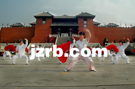 8月13日,来自我市各企事业单位、乡镇和社区的近万名太极拳手,在焦作黄河文化影视城进行了第一次合排。此次合排旨在为“一赛一节”中的“万人穿越影视城”活动作准备。图为太极拳手们正在排练。