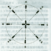 此拳经过近一年的试教证明,具有以下特点: 1.式子少,动作简单易学。初学者只需四五个小时的学习就可独自演练。 2.动作姿势左右对称,身体能得到平衡锻炼。 3.原地运动。在室内、庭院、阳台,工间、课间、出差、旅游等均可随地演练。全套练一遍只需两三分钟,容易坚持不辍。 4.动作基本按呼吸节奏编排,套路熟练后,就可结合呼吸演练,健身效果好。 5.动作舒展,姿势优美。它能充分体现传统太极拳轻松柔和,圆活自然,刚柔相济,连绵不断的风格特点。学会这套拳,能为学练其他太极拳,尤其是作者以前创编的几套原地太极拳打下坚实的基础。 九式名称 1.开合手 2.四面野马分鬃 3.左右搂膝拗步 4。右左手挥琵琶 5.左右金鸡独立 6.右左震脚搬捶 7.右左云手、单鞭 8.左右大鹏展翅 9.右左揽雀尾 收势 原地(九式)太极拳演练场地示意图 图例说明:①场地面积:由中心立足点向四周各迈一小步。 ②东西南北四方均可为起势面向。 ③拳路图像标线,实线(——)代表右手右脚,虚线(……)代表左手左脚。 动作说明 预备:(面向南方) 身体自然直立,两脚跟相触,两脚尖稍外撇;悬顶竖项(头微上顶),沉肩垂肘,提胸拔背,两肩微前合,下颏微内收,敛臀收腹;手指微屈自然散开,手心微含(虎口要保持弧形),两手的指梢轻贴大腿外侧,中指微向下领伸,两肘微外撑(肘与肋之间可容一拳);嘴唇轻轻合闭,舌放平,舌头轻贴上颚,鼻吸鼻呼,呼吸自然;全身放松,精神集中;眼平视前方(图1)。 要点:(1)文字说明中,凡有“同时”两字的不论先写或后写身体某部分动作,全身都要协调运动,不要分先后去做。 (2)运动的方向是以身体的前、后、左、右为依据的,不论怎么转变,总是以胸对的方向为前,背对的方向为后,身体左侧为左,右则为右。 (3)预备式要求的悬顶竖项、沉肩垂肘(屈肘)、含胸拔背、敛臀收腹、上体中正(百会穴与会阴穴成垂线 ‘即中心一线’,个别拳式例外)、全身放松、精神集中、呼吸自然等要贯穿整套拳的全过程。 (4)整套拳除了起、收式身体可以直立和个别拳式身体可以有明显升降外,其余都要屈膝坐身运动。运动中身体高度要保持大体一致,不要起伏不定;屈膝度数大腿与地面约成45~60°,因人而异(屈膝度数越大运动量越大);前弓腿的膝盖应与脚尖成垂线。 (5)两脚的轨迹基本上是踩三条线上。即以练者身体(肩宽)的两侧各划一条线(为两边线),两线之间按等距离再划一条线(为中心轴线)。朝四隅方向(东南、东北、西南、西北)运动的拳式,如野马分鬃等,两脚要踩两边线;朝四正方向(东、西、南、北)运动的拳式,如揽雀尾、搂膝拗步等,要一脚踩中轴线,一脚踩左边线或右边线;横向运动的拳式,如开合手、起收式的开立步和云手的平行步,两脚尖平齐踩在两边线之间。按三条线横向距离的尺度运动,可避免拗步(拧麻花)、两脚踩直线(走钢丝)所造成的两腿关节疼痛和上步、退步、撒步、弓步时身体重心不稳。 (6)要步法灵活,虚实分明。两脚的虚实变换,只能渐变不能突变。要运用碾脚步法(即以脚跟为轴,脚尖外撇或内扣;以脚前掌为轴,脚跟向外碾转或向内碾转)来调整拳式要求的方位、角度。动作熟练后,前后动作要衔接,前一个动作完成就是下一个动作的开始,做完上一个拳式,动作微微一沉,似停非停就接做下一式的动作。一些“丁步”、 “抱球”的动作不要停顿(丁步的脚尖不落地就迈出去),以使整套拳的动作既连贯又有节奏。