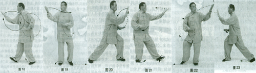 三 、左右搂膝拗步 左式(定式面向东) 1.重心稍后移,上体左转,右脚尖跷起充分内扣,重心移至右腿,左脚收至右脚内侧成丁虚步;同时,右手臂向上、向左、向下、向右、向上划立圆,举于体右侧后上方,手心向上,腕与肩平,臂成弧形;左手臂(先外旋后内旋)先向左,再向上、向右,经面前划弧至右胸前,手心向下;眼看右手(图18、19)。 2.上体再左转,左脚向左前方(东)上步,重心前移,左腿屈膝成弓步,脚尖朝前,右腿蹬伸,脚跟外碾,脚尖斜向前(两脚成夹角45°,横向距离约20厘米);同时,左手向下经左膝前上方楼掌至左大腿外侧,指尖朝前,手心向下;右手臂屈肘卷收,手掌经耳侧沿体中线向前坐腕推掌,手心朝前,指尖向上,掌根与胸平,臂微屈;眼看右手食指(图20)o 右式(定式面向西) (1)上体微右转并向后坐身,重心移向右腿,左脚尖跷起;同时,左手臂伸举至体前,手心向上,腕与肩平(肘、膝上下相对);右手收至左胸前,手心向下,指尖斜向左;眼看左手(图21)。 (2)上体再右转,左脚以脚跟为轴,脚尖充分内扣落地,重心移至左腿,右脚移至左脚内侧,脚跟跷起成虚步,同时,两手臂随体转动;眼仍看左手(图22)。 (3)上体继续右转,右脚向右前方上步,右手搂膝,左手向前推掌…… 其他动作参照左式(图23)。