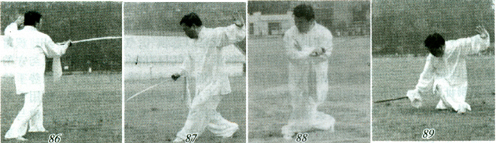 [接上期] 九、风卷残花 1.上步拦扫 左脚落地蹬劲跳起,右脚跳步,左脚经右脚向前落步,右腿蹬伸,腰胯身向左旋转,裹胯合裆,呈左弓步。同时,右手握刀白头上方向右落与肩平向左扫劈,置于左胸前,刀刃向左、刀尖向右前方。左手随刀落下向左平抹停于身体左侧,手心向外,高与肩平,指尖向上。眼随刀运,目视前方,定势面向东北方(图86)。 要点:跳步、劈刀、刀随身运、身刀合一。跳步与劈刀,身体向左转动与两臂运作要协调一致,劲贯刀之外刃。 2.转身下斩(枯树盘根) ①接上势,身体重心向右移,左脚经右脚前盖步;右脚接上一步,左脚再自右脚后插步坐盘。同时,身体向后旋转约270°,右手握刀翻腕随步进向右前下劈刀,接着刀向上甩起、刀尖向下,刀柄白头右方裹脑,随身体下蹲,两手交叉抱于胸前,右手握刀在外,刀尖向左、刀刃向外,左手在内,手心向右外方、指头向右上方,眼随刀运,目视右下方,定势面侧向西方(图87—88)。 ②上动不停,两脚不动,身体继续下蹲,呈坐盘式。同时,两手展开,右手握刀贴地下劈于体右外侧,刀刃向外、刀尖斜向前。左手在左后方、手心向外、指尖向上。目视刀劈下方,定势面侧向北方(图89)。 要点:此势随步法连续劈出两刀,第一刀是盖左步时劈刀,第二刀是插步坐盘时劈刀,衔接要紧凑,不可脱节断续。 3.金蜂戏芯(探臂下扎) ①接上势,左脚后撤一步,屈膝下坐,右脚后移于左脚前虚点,呈右虚步。同时,右手握刀抽回蓄劲于腹前,刀尖向前下方、刀刃向左,左手自上落下抱于右手。目视刀尖,定势面向西北(图90)。