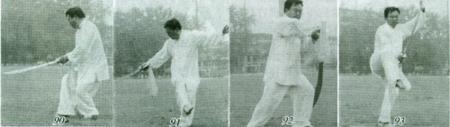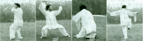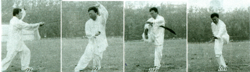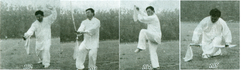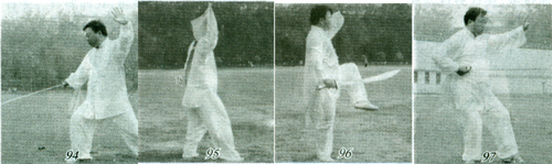 ②上动不停,身体向下松沉,左脚不动,右胯向左扣拧,左脚抬起向前趟。同时,右手握刀随身体下沉向前下方扎刀,刀刃向左、刀尖向前下方。左手随即展开,指尖向前上方,掌心向外,高与肩平。目视刀扎下方,定势面侧向西北方(图91)。 ③上动不停,左脚蹬劲,右脚向前弹步,左脚经右脚向前一步站稳,重心前移于左腿,右脚抬起屈膝于腹前,上体左转,呈左独立势。同时,右手握刀随体转至腹前,左手下落击右手腕。此时右手刀向上甩起下劈,沉腕于腹前,刀刃斜向前方、刀尖斜向上方。左手抬起掤于头左上方,手心向上,指尖向右上方。眼随刀运,目视刀劈前方,定势面向东北方(图92、93)。 要点:向前弹步要轻灵稳健,左手击右手是为了将向左旋转之力转变为甩腕下劈。劈刀时要沉气坐腕,松腰沉胯,力透刀刃。 4.大鹏展翅(转身扫刀) 接上势,右脚向右后落地,左脚接上一步,右脚再向左脚后撤一步,左脚抬起呈左独立势。同时,上体随步法转动约360°。右手握刀下劈再向上缠头裹脑下按于右胯前,刀刃向下、刀尖向前。左手下落画圆经腹前与右手交叉抄起掤于头左上方,手心向前,指尖斜向右上方。目视前方,定势面向东方(图94—96)。