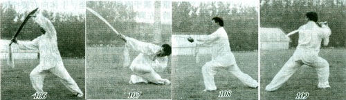 要点:劈刀、缠头、探掌,一气呵成,要气沉丹田,有以静制动、一触即发之势。 3.青龙入海(进步前刺) 接上势,右腿蹬伸,左脚落地,呈左弓步。同时,腰胯沉劲,右手握刀向前下方沉腕前刺,刀尖向前下方、刀刃向下方。左手向上棚于头左上方,手心向左上方,指尖斜向右上方。目视前下方,定势面向西南方(图102)。 要点:左掌上掤后引,左腿弓步与沉腕前刺如潜龙人海,以意引形、以形传神,舒身展臂,协调自然。 4.崩刀 接上势,左腿屈膝下坐,右脚向前上步虚点于左脚前,呈右虚步。同时,右手握刀,手腕上挑崩刀,刀尖向上方、刀刃向前方。左手下落按于右手腕,助右手崩刀之势。目视刀尖,定势面向西南方(图103)。 要点:崩刀时,气要下沉、松腰、落胯,脊后鼓,做到力由脊发,达于手腕,崩刀才能干净利落、劲贯刀背。 5.震足提刀 接上势,右足抬起后撤震足;左脚随屈膝抬起,脚尖向下,脚面微有掤劲,呈右独立式。同时,身体向右扣拧。右手握刀上提于头右方,刀尖斜向左下方、刀刃向外。左手按于右手腕,臂圆撑,刀背轻贴于左大臂之上,助右手提刀之势。目视刀尖,定势面侧向西南方(图104)。 要点:震足丹田吐气,以助提刀之势,一气呵成,不可稍有迟滞。提刀时两臂要圆撑饱满,气势松静沉稳,提顶吊裆,周身合劲,蓄以待发。 十一、拨云望日 1.弓步推刀 ①接上势,上体右转约90°,左脚落地、脚尖向外撇,两腿屈膝下蹲呈坐盘步。同时,右手握刀,左手移按刀背,两手按刀于体前下方,刀刃向下、刀尖向左。目视刀身下方,定势面向南方(图105)。 ②上动不停,左脚蹬伸,右腿向前跨步,松左胯,送右胯,腰胯身向左旋转,呈右弓步。同时,两手握刀随身长起向前推刀,刀尖斜向左上方,刀刃向前上方。目视推刀前方,定势面向西方(图106)。