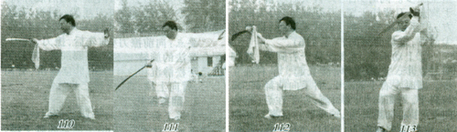 ②以右脚为轴,上体旋转一周,左脚抬起随体转落于右脚左侧后方。接着右脚抬起,屈膝吸胯,左腿屈膝下坐,呈左半独立步。同时,右手握刀随转身向后扫劈于身右侧,再随抬膝抖腕翻刀,刀尖向右侧下方、刀刃斜向前。左手随势展开于身体左侧后方,手心向外,指尖向上。目视刀身,定势面向西方(图110—111)。 ③上动不停,左腿蹬伸,右腿前上一步,屈膝松胯,呈右弓步。右手握刀自下向上抹推,高与脸平,刀刃向外、刀尖向右。左手按于右手腕助右手推刀之势。目视刀推前方,定势面向西方(图112)。 要点:刀势随身法、步法,反转变化,随身劲吞吐沉浮,内外统一,周身劲整。 2.左右撩腕 ①身体重心后移,向左转拧腰胯。左腿屈膝下坐,右脚收回虚点于左脚前,呈右虚步。同时,右手握刀微下落,随体转向左上方提撩腕,刀柄置于头前上方,刀尖向下、刀刃向外。左手随动仍按于右手腕内侧。目视刀尖,定势面侧向西方(图113)。