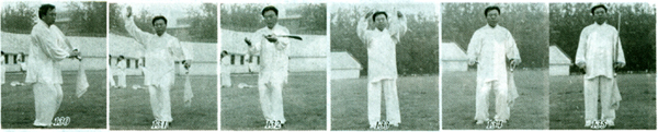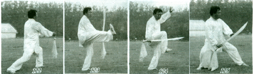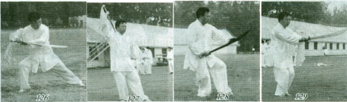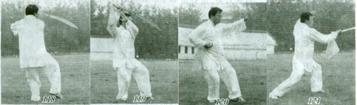 要点:坐盘到独立势:要稳健沉实,蹬腿长腰与刀探刺要——气贯串。头领脊竖,气要下沉,刺刀要有抖劲,劲贯刀刃。 3.左右撩刀 ①上体右转。左脚不动,屈膝下坐,右脚下落虚点于左脚前,呈右虚步。同时,右手握刀先翻腕刀向右画一圆弧,再由下向左上方撩扫,刀柄置于头左前方,刀刃向上、刀尖向前下方。左手由后收回按于右手腕内侧。目视刀尖,定势面向东方(图118)。 ②上体右转,右脚抬起,脚尖外摆,屈膝下坐。左脚向前虚点于右脚前,呈左虚步。同时,右手握刀翻腕刀向左后下甩,画一大弧向右前上方撩扫,刀柄置于右头上方,刀刃向上、刀尖向前下方。目视刀尖前方,定势面向东方(图119)。 ③两脚不动,右手握刀下落,刀柄置于肋间,手心翻转向上,刀刃向左、刀尖向前方。左手移向脸左前方,手心向外、指尖向上。目视刀尖,定势面向东方(图120)。 ④左脚向前跨步,屈膝松胯,右腿蹬伸,胯、腰、身向左旋转,裹胯合裆,呈左弓步。同时,右手握刀前刺,高与胸平,刀刃向左、刀尖向前。左手向上翻转棚架于头左侧上方,手心向左上方,指尖斜向右。目视前方,定势面向东方(图121)。