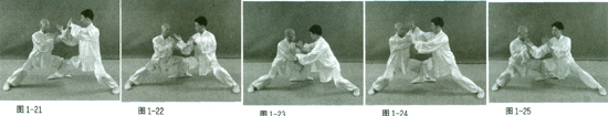 动作二: 甲方左转,左手轻握乙方左手腕,右手前臂置于乙方上臂中段,并向左上捌带;乙方顺势右转,左臂拉伸外旋,右手置左肩前(图1-21)。 动作三: 甲方继续左转下沉,两手向左履带;乙方继续左转伸臂(图1-22)。 动作四: 乙方左转成弓步,左前臂顺甲方右前臂下摆,掌心朝下,右手曲臂前挤;甲方同时右转,两手分别轻按于乙方右手腕与肘关节处(图1-23)。 动作五: 乙方右转,右手轻握甲方右手腕,左手置于甲方右上臂中段往右履带(图1-24)。