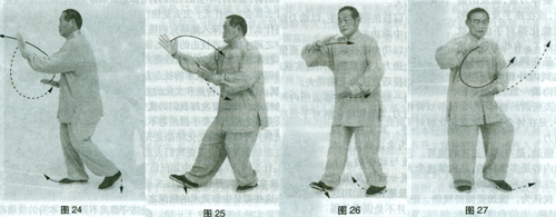 四、右左手挥琵琶 右式(定式面向西) 上体微右转,左手再稍前推,重心微前移,左脚稍向前跟步,脚尖外撇约45°落地,重心移至左腿,随之上体微左转,右脚稍向前移成虚步,脚跟着地,脚尖稍跷起,膝微屈。同时,右手臂先稍向右,再向前(手臂内旋转外旋)、向上挑举,指尖高与鼻平,手心向左;左手臂(先内旋后外旋)向左、向下、向右画弧至右前臂和肘的内侧,手心向右(右肩、肘、手与右胯、膝、足上下相合即“外三合”;鼻尖与右手尖、足尖三尖对齐即“三尖对”)。眼看右手食指(图24、25)。 左式(定式面向东) 1.上体左转,右脚以脚跟为轴,脚尖充分内扣,左脚以前脚掌为轴,脚跟向内碾转,重心渐渐移向右腿。同时,右手臂内旋经面前向左画弧至左胸前,手心向下,指尖斜向左,左手臂外旋从腹前亦向左画弧至左腹前,手心向上,指尖斜向右,两手上下相对“抱球”(图26、27)。