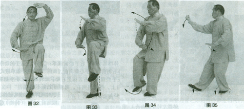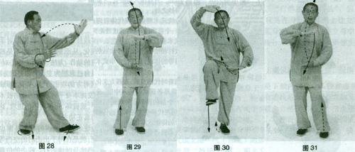 2.上体稍向右转,再向左转,左脚随转体向左前方移动,脚跟着地,脚尖稍跷起成虚步。同时,左手臂内旋向左、向前上方画弧挑举,手心向右;右手向左、向内(稍向下)、向左、向上画弧至左肘内侧,手心向左,其他动作参照右式;眼看左手食指(图28)。 五、左右金鸡独立 左、右式(定式都面向南) 1.上体右转45°(面向南),左脚尖内扣,重心移至左腿,右脚以前脚掌为轴,脚跟内碾,脚跟跷起成虚步,两脚尖朝南。同时,左手臂内旋由头前向右画弧至右胸前,手心向下,指尖向右,腕约与肩平,沉肩垂肘;右手臂外旋随腰向右带至左腹前,手心向上,指尖向左,两手心上下斜相对“抱球”,臂成弧形;眼看左手(图29)。 2.左腿微屈站稳,右手贴近身体向上托掌至胸前时,手臂内旋继续向上托掌至额头上方,手心斜向上,指尖向左,臂成弧形;左手经右手外向下按掌至左胯前,手心向下,指尖斜向右,臂成弧形。与两掌托按同步,右腿屈膝上提,脚跟下蹬,脚尖上跷,小腿垂直(提膝高度因人而异)。眼向前平视(图30)。 右式 1.右脚下落(先脚前掌着地,然后慢慢全脚踏实),重心移至右腿微屈站稳。同时,右手上托,左手下按,左腿屈膝上提。具体动作要求与左式同(图31、32)。