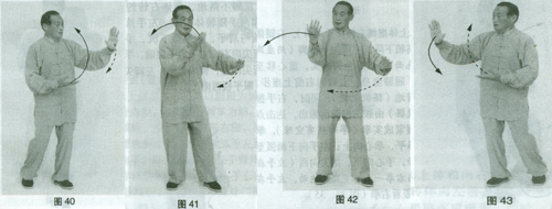 七、云手、单鞭 右云手(面向南) 1.上体微右转(胸向东南),左脚尖内扣,重心移至左脚,右脚跟内碾稍上跷成虚步。同时,左拳变掌,手臂内旋向左伸展,手心斜向前,指尖向上,腕约与肩平;右手臂外旋向左画弧至左腹前,手心斜向内,指尖斜向左;眼看左手(图40)。 2.上体再微右转(胸向南),重心移向右腿,右腿落实,脚尖向前。同时,右手向上、向右画弧至左胸前(手臂外旋),手心向内,指尖斜向上;左手向下、向右画弧至左胯前,手心向下,指尖斜向右前方;眼看右手(图41L 3.上体继续右转,右手经面前向右云转至体右侧前方,手心斜向前,指尖向上;左手经腹前向右云抹至右胸前,手心斜向上,指尖斜向右。眼看右手(图42、43)。