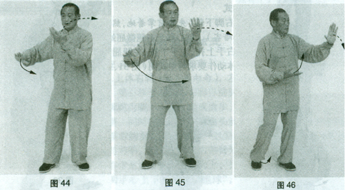 4.上体微左转(胸向南),重心移向左腿。同时,左手向上、向左画弧云转至右胸前(手臂外旋,手心向内,指尖斜向上);右手向下、向左画弧至右胯前,手心向下,指尖斜向左前方。眼看左手(图44)。 5.上体继续左转,左手经面前向左云转至体左前方,手心斜向前,指尖向上;右手经腹前向左云抹至左胸前,手心斜向上,指尖斜向左;眼看左手(图45、 46)。 #要求:①按以上云手的动作要求,左手经过面前三次变钩手做单鞭式。 ②两手云转时,上手手指高不过眉,下手手指低不过裆。 ③云手时两脚只作虚实转换,不移动脚步。眼随看上手。 (待续)