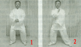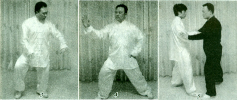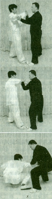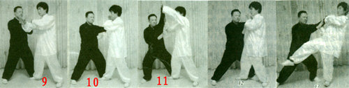 一、“懒扎衣”立意与特点 1.“懒扎衣”是一古老拳式名称,最初见于明戚继光(1528—1587年)32式长拳中,由此可窥得在太极拳发展过程中,前辈先贤们从其他拳种汲取到了诸多精华与养分。 2.和兆元宗师曾说:“膛中分峙如剑阁,头上中峰似璇玑”,这表明“懒扎衣”拳式的特点:懒扎衣定式右臂呈弧形,左手卡腰,右弓步,形似茶壶状;翻掌时两手如抱球,球不能抱丢,松肩转肘,腰脊中正,两仪阴阳分明,落脚根基要稳。 3.本式包含“翻掌”,是“拦扎衣”一式细分的小招式,双臂滚动、阴阳互变之中使用“分筋错骨”手法。 二、“懒扎衣”演练法 1.“懒扎衣”式从“金刚三大对”的收势开始(图1),两脚间距与肩同宽,涌泉穴虚,呈平行步型;下颏微内收,闭口叩齿,舌尖轻抵上腭(上牙根处),头顶百会穴微上顶,似有线上牵之意,使颈项竖直,谓虚领顶劲;含胸拔背,正腰落胯,提肛裹臀,收腹吊裆,自然腹式呼吸,静心凝神,物我两忘,全身透空;右手握拳轻放于左掌心,肘、膝关节放松微屈,两眼平视,目光不着意落于周围某物上。 2.右拳变掌向上抬至鼻高时向右,左掌向左上,掌心相对如抱球状各画一圆弧,重心由两腿中间逐步转移至右腿(图2)。 3.左胯松沉,左脚向左侧进步,右脚跟步呈右虚步。同时左掌向外上画一圆弧,左肘向外上旋,肘与掌如杠杆状。右掌随左掌一起向左侧挤按。左掌呈反掌,指尖斜向下,右掌指尖斜向前上与小腹同高(图3)。 4.右脚向右侧开步呈右弓步。同时左掌内旋向内放于左侧骨盆上缘,拇指向前,其余四指向后下,虎口卡腰,肘尖稍内扣;右掌向右上顺时针方向外旋画弧。眼平视(图4)。  三、“懒扎衣”技击法解 用法一: 1.甲乙双方搭手竞技,甲方(黑方,贾澎)重心在左腿,右手搭乙方(白衣,和东升),左手看住乙方右肘(图5)。 2.甲方右手领乙方右手向自己面门处走,左手看住乙方右肘,同时重心虚实向自己右侧转化(图6)。 3.甲方顺直乙方右臂,右手拿住乙方右腕部,顺其势,借其力继续向己方右下侧画圆,同时甲方左手向上侧推拿乙方肘部(图7). 4.甲方顺风顺水,游刃有余之间合住身体,乙方就是想走也徒唤奈何(图8)。 要点1:松身凝神,自然而然,呼吸即阴阳,呼则自然落下,吸则自然提起;身体虚灵活泼,意欲活泼,意欲腾挪;开合呼吸,内气随机自脚底涌泉上行至脊背,过大椎至头顶百会穴,下行沉人丹田,进而落于涌泉,形成大小周天。此全在内不在外,一片神行,丝毫无练拳之象,即所谓太极拳在内不在外。 要点2:“顺”在和式太极拳中有两重含义: (1)修炼中要“五顺”即:顺身、顺腿、顺手、顺脚、/顷意。顺者,通达不别扭,意何往,身必何往。手向左去身顺之去,腿向左去脚亦顺之去。顺脚时,以后脚跟为轴,摆动脚尖随势而动。走架以腰带动四肢,圆裆活胯,步随身换,手与身应,身与手合。上欲动而下自随之,下欲动而上自领之,上下动而中节攻之,中节动而上下和之o (2)技击中“求顺”o顺者,自然也。我的技艺高于对手,“艺高人胆大”,技击相搏时就“心要占先、意要胜人、身要攻人、步要过人”,当然是一顺百顺,胜对手也是顺其自然!若我技艺与对方相当甚至略逊,就必然自处弱势,守雌求柔,与其周旋。如何“求顺”呢?要气定神凝、以静待动、静观其变、知己知彼、应对从容,如此才能辨清对方意图,避其锋芒,顺势引之。正确对待“背势”,分析背、解决背、扭转背、摆脱背、战胜背,同时去发现顺、捕捉顺、创造顺、利用顺,以顺治逆,“彼有力,我亦有力,我意在先”,避其实,就其虚,蹈其隙而击之,引其过与不及处就可因人取势,制其手足无措而顾此失彼! 要点3:“棚”与“捌”,二者是太极拳主要技法,尤以“棚”是太极拳诸劲之源。无论左旋右进,前击后挡,“棚”决不可丢。棚是长时间行功走架形成似松非松、柔中寓刚、灵活而又稳重;充满韧性的劲路,是太极拳摒弃后天拙力所求得先天内劲。与棚劲相比,“掤意”更重要,意的修炼在劲之上。“太极拳一举动,周身皆是意”,和式太极拳教学要求把“捌意”与“棚劲”蕴涵于整个行功走架之中,称为:“灌”“意”与“劲”人身,如水银注入容器一样,无处不在。技击中“掤”的着力点以人体活关节为佳,对手难以滑脱。 “挒”法为扭转、转折之法,把对手手、肘等部位扭转,造成其筋骨姿势方向呈反向,可在很短时间内使对方手臂折断或损伤,以局部制服对方。有些拳家称这一手法为“分筋错骨”的手法。遇敌时“捌”手要快、巧妙,“捌”是以横力取直劲的技击方法,可以截断对方劲力的来源。迫使对方改变直力,我顺人背,这种手法和身法之轻灵、神妙有“四两拨千斤”之美誉。 用法二: 如果乙方要逃脱甲方的进攻,甲方可以听乙方劲力的性质,进自己左腿,挤按乙方右侧肋部;甲方亦可顺乙方右臂,进自己左腿,以左肘击打对方(图7)。 用法三: 1.双方搭手如图9、图10,乙方进右步,同时双手把甲方左臂向甲方左上方挤,意欲从左侧把甲方拔根击倒(图11)。 2.甲方旋腰松胯,左臂顺乙方劲力从左上方由外向内画圆,身体松沉,化尽乙方之劲;同时左腿插入乙方身侧后,重心虚实由右侧转至左侧,套封住乙方身体,左手领乙方左手,右手端住乙方左肘,此时乙方身体已经‘‘空’’了(图7)。 3.甲方合住身法以整击散,对手已经是强弩之末,我自从容,把乙方如稻草人一般抛出(图13)。 要点:“沾与黏”是太极拳技击基础要件,也是提高太极拳实战能力必经