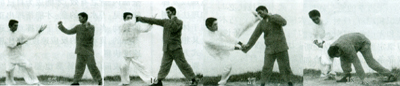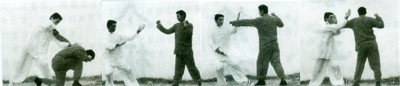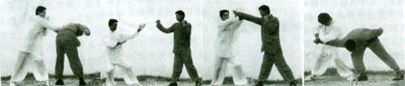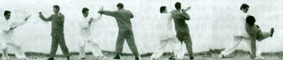 简析:身体向后倾斜披姿势,起脚前踢,称为披身踢脚。此式在技击中多为败中求胜之法,乃退中寓攻的妙招。用于擒拿时,即取踢脚失效的后继之势作为控制之法。左右踢脚动作应见敌势而适机选项用,不管脚击中与否,均可作夹压制敌的招法,长期操练自会领悟。     太极拳的种种拿法须在推手时经常趁势拿人、反拿,缓解被拿。才能运用熟练,熟能生巧。腰腿身手,柔活协调,越练越轻灵不斗力,总以触觉灵敏、因敌变化、顺人之劲、借人之力为原则,太极拳家功夫深者,拿法处处轻灵圆转,舍己从人中控制对方劲路,笔者以上举的五例,为太极拳三十七式之列,其中的拿法千姿百态。以此列出,又是在平时生活中常遇险境时而信手拈来就用的最简捷、最实用的几式,读者诸君不妨细心一阅,试着模仿一二,或许你在车船、巷道里遇上与歹人争斗的场面,会派上用场。  |