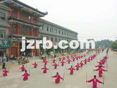 为迎接“一赛一节”,近日,温县进行了“万人演练太极拳”彩排。图为“万人演练太极拳”彩排中的太极双剑表演方阵。