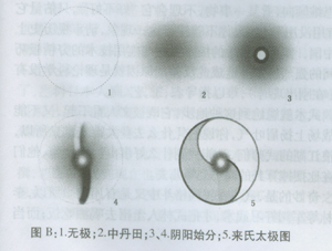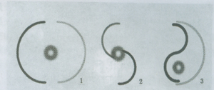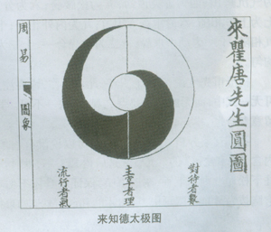 霍梦魁所传武式太极拳为李启轩所传拳架,由李启轩之孙李福荫传于霍梦魁。此拳每势均以“擎、引、松、放”四字为宗旨,要求练就“引进落空合即出”的发放功夫,充分体现了武禹襄创拳的初衷。 武禹襄在创武式太极拳之前,曾赴赵堡镇向陈清平学习赵堡太极拳。因此,武式太极拳除上述特点之外,也体现了赵堡太极拳的拳理和背丝扣的演练方法。霍梦魁所传武式太极拳的两手的运行,都按背丝扣的方法演练,96个势子,势势如此。可以说,武式太极拳继承和发展了赵堡太极拳拳理和背丝扣的演练方法。 霍梦魁先师(1889~1962年)于1953年到沈阳传授武式太极拳。冯景春老师于1954年拜霍梦魁为师,学练武式太极拳,至今已50年。武式太极拳“阴阳欲分分又合”的内功演练方法,使冯老师受益匪浅,虽已是76岁高龄,仍然身轻体健;与年青人交手,仍可发人于丈外。因此,挖掘整理这一优秀拳种,具有十分重要的意义。 武式太极拳特点可归纳如下: 引进落空合即出, 赵堡太极拳源于道家,后传至王宗岳,王宗岳又传蒋发(1574~1655年),蒋发又传至赵堡镇,至陈清平第七代。赵堡拳第九代传人杜元化,于1935年在其《太极拳正宗》一书中,简述了背丝扣的概念和64势背丝扣图示。赵堡太极拳的拳理和背丝扣演练方法,依据于来知德太极图。 来知德(1525~1604年)号瞿唐,是明代著名理学家。他曾远客万县,于翠竹溪水深山中,潜研《易经》,悟道修炼达29年,后于明朝万历二十六年(1598年)完成世称绝学的《周易集注》。在《周易集注》中,他绘制了“来瞿唐先生圆图”(右图),后人称为“来氏太极图”。此图依照“主宰者理、对待者数、流行者气”而绘之,蕴涵天地万物的演化之理。 近年来,人类对宇宙的认识越来越深,观测到的我们所在的银河系的形状极像来氏太极图的形状。来氏太极图的中心圆圈为太极之本体,内存先天一气,对应着银河系的“核心”。根据老子《道德经》来解释,此“核心”为先于天地之前而生,由“道生一”而得,进而变化出后天阴阳,即“一生二”。银河系有两条“螺旋线臂”,我们所在的太阳系在其中一条线臂的外端三分之二处,正暗合老子所说“二生三,三生万物”。科学家对银河系的形成作了类似于图A的描述,从中可见太极本体先旋转成椭圆球体,而后从无极而有极,再从有极分成阴阳,形成“螺旋线臂”,从而构成类似于来氏太极图的形状。 道家认为人身即为一小宇宙,黄帝《阴符经》也认为“宇宙在乎手,万化生乎身”。演练太极拳时,两只手臂极像银河系的螺旋线臂,人体的“核心”就是身体中的太极本体——中丹田。中丹田位于脐内与命门之间内存先天一气。来氏图的中间一线为阳中有阴,阴中有阳,也表示天、地、人一气贯通。来氏太极图和“主宰者理、对待者数、流行者气”是赵堡太极拳的理论依据,“背丝扣”即源于来氏太极图。 太极拳从无极起势,在图B一1中以虚线圆表示。在人体内,丹田中的先天一气也是无极的,以无边界的淡灰色圆形图表示于图B一2中。 怎样从无极到有极呢?即意念内气从“降宫”降入丹田,此时阳气下降,肾之阴气必从下而上,此为无极而有极。于是,丹田之中,太极缘起(图B一3,B一4)。丹田气的运转将产生阴阳两条“螺旋线臂”,如图B一5中黑色、灰色线所示,此即来氏太极图之意,中心深色圆圈代表太极本体,即丹田先天一气。练拳时,丹田运转带动左右两手,分别沿阴阳螺旋线运行,此为“先天引后天”。由此,赵堡太极“背丝扣”可定义如下:“背丝扣”即来知德太极图,“背丝”为其中两条相反的螺旋线,“扣”即两条螺旋线扣于太极本体上。