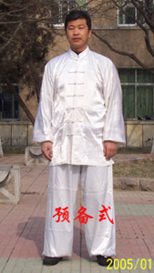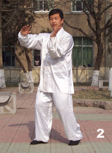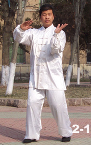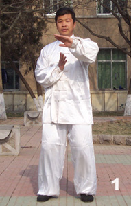 面、眼向正北。平心静气,周身放松,眼平视正前方。双腿分开一肩宽,自然站立。两手心向里松垂于两胯外侧(图一预备式) 1、眼法不变向北。身略左转,胸向正前方。两腿随身左转下蹲,松裆弓膝成小正马步。同时右手顺缠走里左上弧线转到胸前,手心侧向左后上斜角,中指扬向右前上斜角。左手配合右手同时逆缠走外右上弧线转到下颏前方的一尺位置,手心侧向右后下斜角,中指扬向右前上斜角(图1)