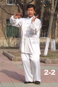 2、眼法不变向北。身略右转,胸向右前斜角。右腿变顺缠,弓膝松裆塌劲以右脚跟为轴,向右前斜角外摆脚尖45°;左腿同时变逆缠,以左脚尖为轴,向左后斜角旋转脚跟,成右小盘步。同时右手变逆缠,以手领肘走外右上弧线向右上斜角上转,高与口齐,手心侧向右前下斜角,中指扬向左前上斜角;左手配合右手变顺缠,在原处松肩沉肘,下塌外碾,走里右小弧线,手心侧向右前上斜角,中指扬向左前上斜角,两手距离一肩宽(图2,2-1)。